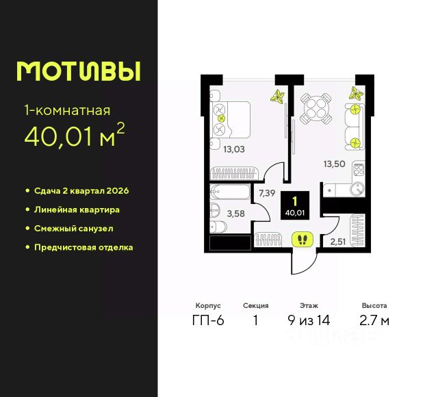 1-комн. квартира с предчистовой отделкой в ЖК "Мотивы" на 9 этаже. Общая площадь: 40.01 кв.м., жилая: 13.03 кв.м., площадь просторной кухни-столовой: 13.5 кв.м. Все окна выходят на одну сторону. В квартире один совмещенный санузел. Высота потолков 2.7 м.