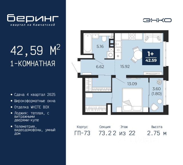 Однокомнатная квартира в ЖК "Беринг" на 2 этаже. Квартира без отделки, полностью готова к чистовой отделке и дальнейшему ремонту. Общая площадь: 42.59 кв.м., жилая: 13.09 кв.м., площадь просторной кухни-столовой: 15.92 кв.м. Все окна выходят на одну сторону. В квартире одна лоджия, один совмещенный санузел. Высота потолков 2.75 м. Дом монолитный, многоподъездный, переменной этажности, от 9 до 22 этажей. Квартира находится в 73.2-й секции высотой 22 этажа в корпусе ГП-73. На этаже 7 квартир. В подъезде 1 пассажирский и 1 грузовой лифт. Окончание строительства - 4 квартал 2025 года. Оформление сделки по договору долевого участия. Подобно знаменитому исследователю, мы чувствуем себя первооткрывателями этой локации. Хотим показать новую суть места, сформировать для вас жизненный опыт, которого ещё не было. Беринг — район зелёного цвета. Беринг — район, который откроется вам с другой стороны. Впечатлит новым уровнем комфорта и качеством жизни. Беринг — открытие на карте города. Первый квартал расположен в районе Тура, в границах улиц: Камчатская Западносибирская Энтузиастов. Вокруг уже есть всё для того, чтобы ежедневная рутина была лишь частью жизни и не доставляла дискомфорта. Школы и детские сады, магазины и аптеки, поликлиника, места для семейного отдыха, пеших и велопрогулок, и даже рыбалки. Масштабное озеленение дворов — визитная карточка ЭНКО и ваш оазис спокойствия, чтобы отвлечься от повседневности. Раскидистые деревья, кустарники, травы и цветы — осталось остановиться, вдохнуть и расслабиться, глядя на эту природную красоту. Стилистика подъездов продолжает концепцию Беринга, вдохновлённого Камчаткой: сдержанный, но при этом впечатляющий дизайн соседствует с удобством и функциональностью. #z3S5b5