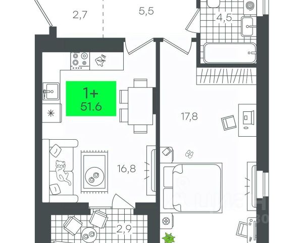 Общая площадь: 26 кв.м, дополнительная узаконенная площадь: 9 кв.м (идеально для второй комнаты или гардеробной).