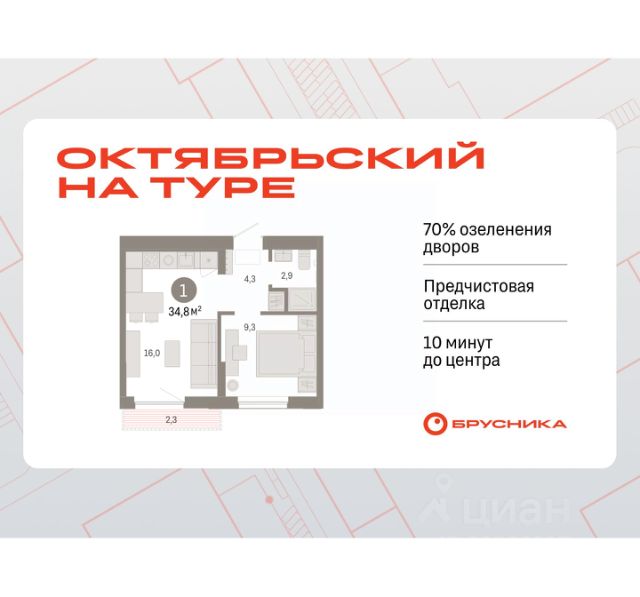 Квартира в счёт первоначального взноса по программе обмена. Квартира с кухней-гостиной и одной спальней в Октябрьском на Туре. Особенности планировки: лоджия, предчистовая отделка. квартиры в нашей базе: ОКТ09-Ж1.13.3. Район Проект расположен на берегу реки, в одном из самых живописных и экологичных районов Тюмени. За последние годы облик района изменился. По соседству с индивидуальной застройкой выросли многоквартирные дома. При проектировании "Октябрьского на Туре" нашей приоритетной задачей стало сохранение природного ландшафта: мы постарались деликатно вписать в него современную архитектуру. Квартал удачно расположен с точки зрения дорожной инфраструктуры. На автомобиле путь до центра города составит 15 минут. Добраться до набережной и главных тюменских достопримечательностей можно и на общественном транспорте. В пешей доступности находится автобусная остановка. Проект По мастер-плану здесь будет восемь домов. Ядро застройки составляют замкнутые кварталы переменной этажности. Их высотность понижается по мере приближения к реке. На углах участка мы разместили башни-доминанты. Одной из достопримечательностей квартала станет парк на Туре — здесь появится зеленая зона протяженностью около 6 километров для пеших и велопрогулок. Смысловая ось квартала — широкая главная улица с высаженными вдоль неё высокими деревьями. Они создают тень и работают как шумо- и пылезащитные экраны. Это место сосредоточения основных пешеходных и транспортных потоков, на сторону которых мы ориентировали большинство коммерческих помещений. Отсюда жители могут свернуть на тихие соседские улицы и попасть на внутриквартальную площадь — ещё одну точку притяжения.Квартира в счёт первоначального взноса по программе обмена. #z4DS9T