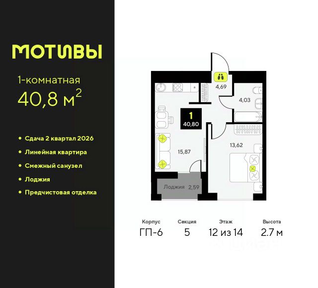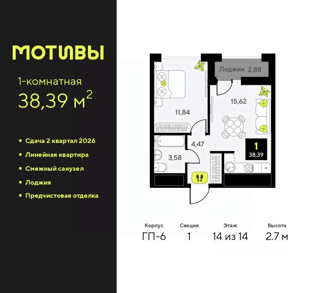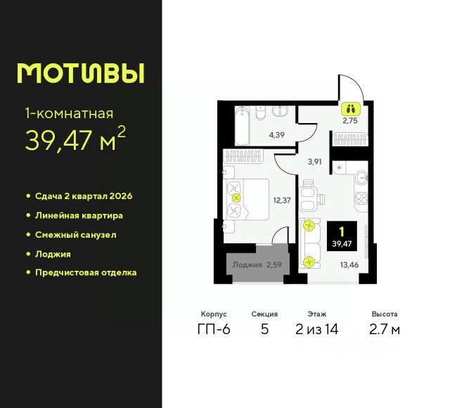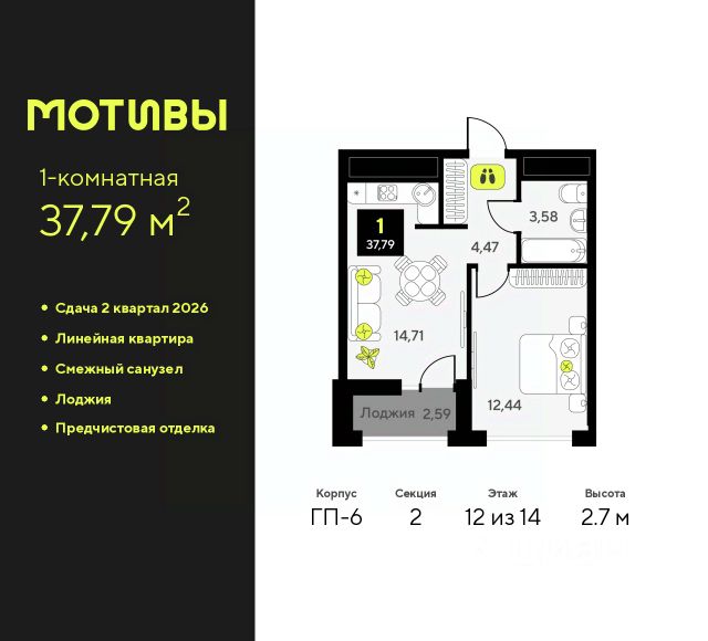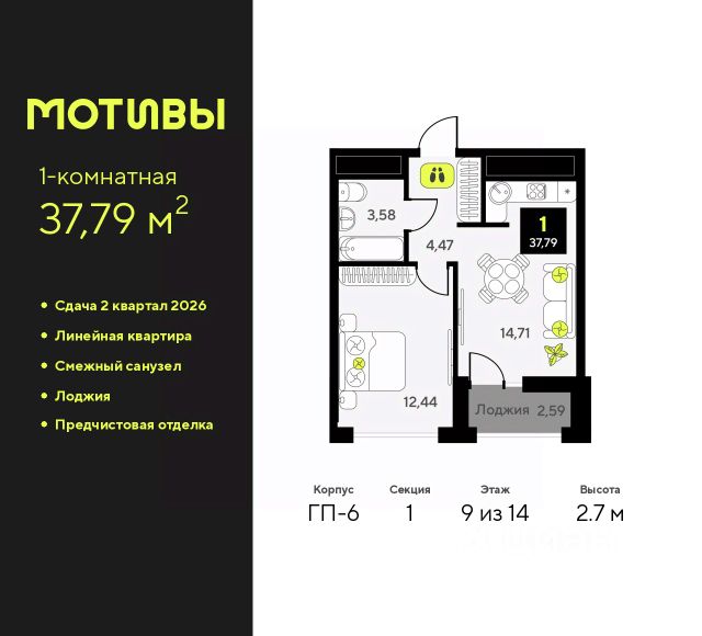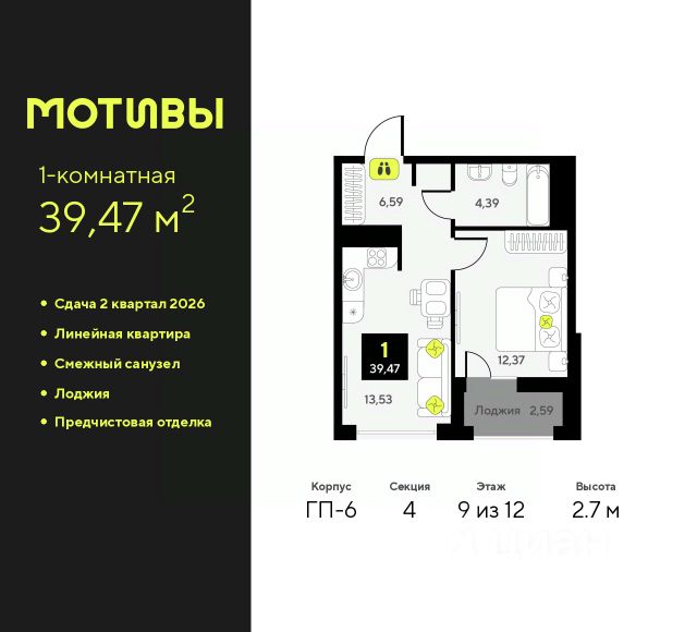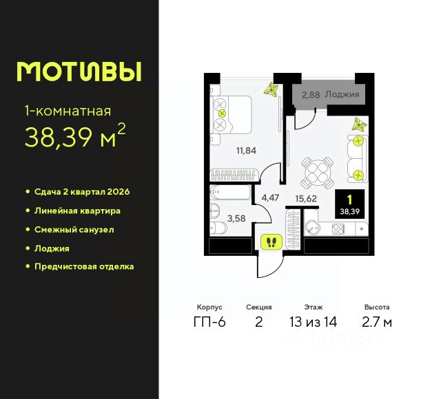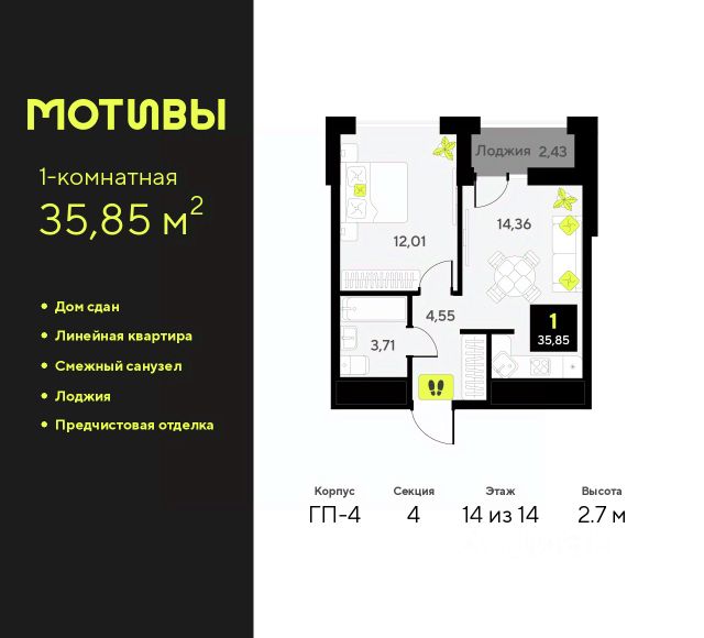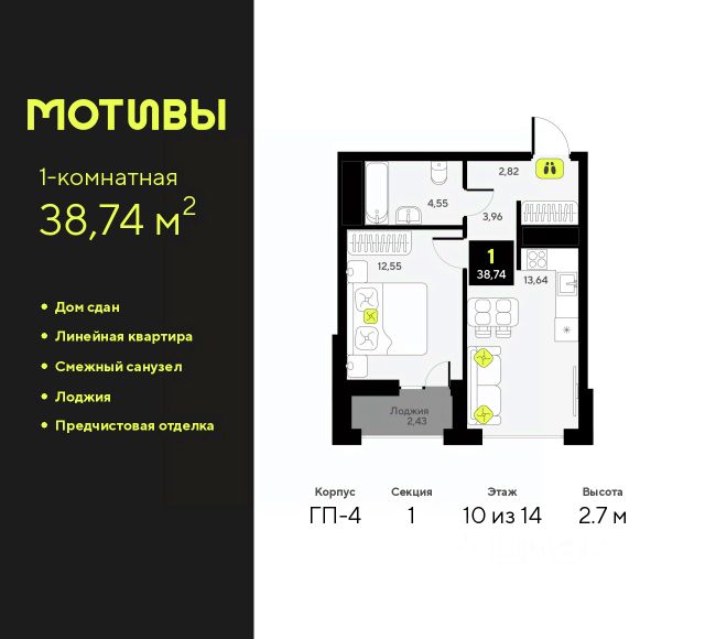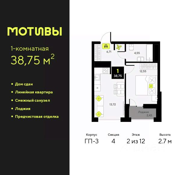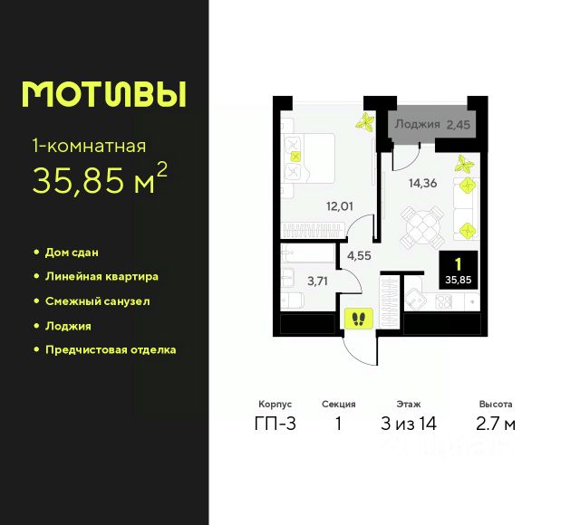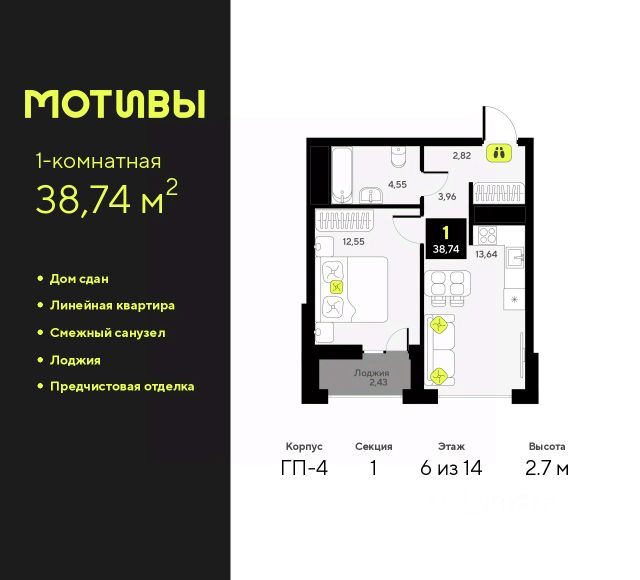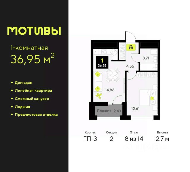 Продается 1-комн. квартира от застройщика с предчистовой отделкой в ЖК "Мотивы" на 8 этаже. Общая площадь: 36.95 кв.м., жилая: 12.61 кв.м., площадь просторной кухни-столовой: 14.86 кв.м. Все окна выходят на одну сторону. В квартире одна лоджия, один совмещенный санузел. Высота потолков 2.7 м. Квартира будет сдаваться с предчистовой отделкой White Box: выровнены и оштукатурены стены, проведено электричество и отопление, установлены радиаторы. Вы также можете приобрести квартиру с ремонтом от застройщика, представленным в трех цветовых решениях Scandi, Wood и Coffee и включающим ламинат, обои под покраску, двери, натяжной потолок и санузел с сантехникой. При желании вы можете заказать отделку под ключ, варианты возможных решений представлены в альбоме фотографий. Дом монолитный, черырехподъездный, переменной этажности, от 12 до 14 этажей. Квартира находится в 1-й секции высотой 14 этажей в корпусе ГП-3. На этаже 12 квартир. В подъезде 1 пассажирский и 1 грузовой лифт. Строительство завершено, дом сдан в 4 квартале 2024 года. Оформление сделки по договору купли-продажи. Закрытая от автомобилей территория, безопасный двор и камеры видеонаблюдения - гаранты вашего спокойствия. Квартал будет располагать богатой инфраструктурой: на первых этажах разместятся магазины, пекарни, кофейни, пункты выдачи, аптеки, детские центры, цветочные салоны и многое другое, что сделает жизнь поистине комфортной. Рядом находится парк общей площадью почти 5000 м², в котором располагаются локации для игр и отдыха жителей, здесь можно совершить утреннюю пробежку или прогуляться после рабочего дня. В парке есть зона воркаута с тренажерами для взрослых, игровые комплексы с горками и канатный комплекс для детей разных возрастов, качели и лавочки для отдыха, площадки для командных видов спорта и для панна-футбола. В ЖК "Мотивы" всё продумано до мелочей: светлые холлы входных групп, оформленные в едином стиле, просторные колясочные, лапомойки для питомцев. На территории комплекса находятся 2 8-ми этажных паркинга и более 1000 м/м на открытой парковке. Жилой комплекс находится в одном из экологически благоприятных районов Тюмени, недалеко от Плехановского бора. При этом до центра города можно добраться за 15 минут, а до международного аэропорта Рощино за 13 минут. Окончание строительства: ГП 1, 2, 3, 4 сдача до конца 2024 года, ГП 6, 7, 8 сдача 2 квартал 2026 года. #z4a8tZ