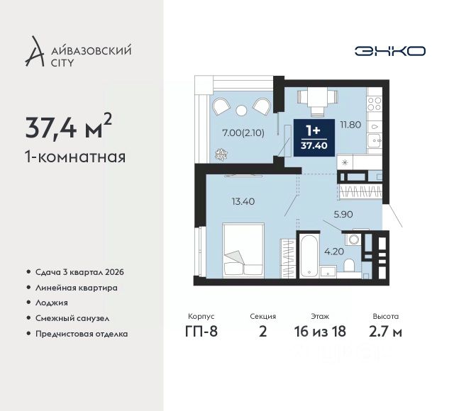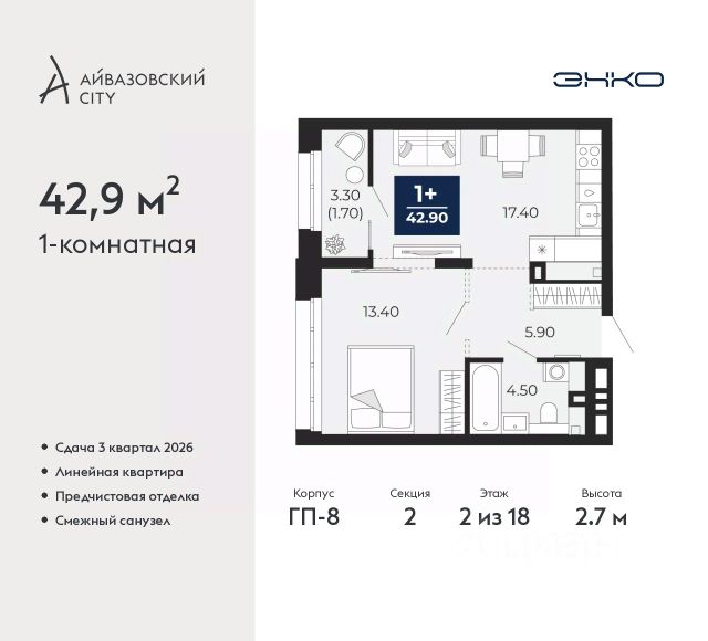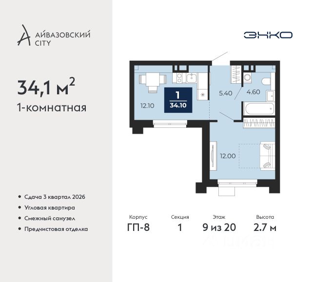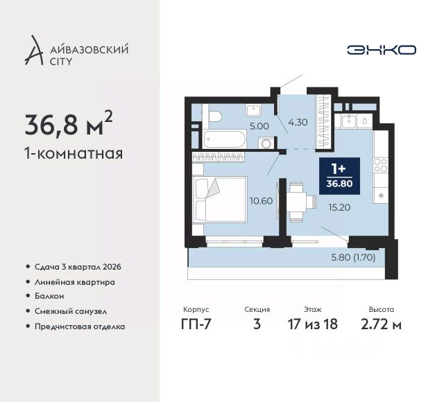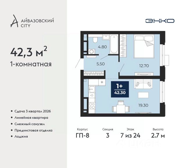 Однокомнатная квартира от застройщика с предчистовой отделкой в ЖК "Айвазовский City" на 2 этаже. Общая площадь: 51.1 кв.м., жилая: 10.9 кв.м., площадь просторной кухни-столовой: 24 кв.м. Квартира угловая, идеально подойдет любителям тишины и панорамных видов. В квартире одна лоджия, один совмещенный санузел. Высота потолков 2.72 м. Дом монолитный, многоподъездный, переменной этажности, от 9 до 24 этажей. Квартира находится в 1-й секции высотой 24 этажа в корпусе ГП-7. На этаже 6 квартир. В подъезде 1 пассажирский и 2 грузовых лифта. Окончание строительства - 3 квартал 2026 года. Оформление сделки по договору долевого участия. Новый жилой район располагается в живописном месте на берегу Туры в центральной части города. Принципиально новое пространство для жизни в центре современного города для тех, чьи мечты сбываются, кто нацелен на постоянный рост, перемены к лучшему для себя и своих близких. Каждая деталь Айвазовский City вдохновляет и заряжает на новые свершения: авторская архитектура, сбалансированная продуманная инфраструктура, дизайнерские дворы со спортивными и детскими площадками, парковые зоны с фонтанами, водный канал, украшающий центральный прогулочный маршрут района и многое другое. В 2019 года проект стал лауреатом престижной премии Urban Awards 2019 в номинации "Лучший строящийся региональный жилой комплекс бизнес-класса". Главная особенность Айвазовский City - соседство разных архитектурных школ в рамках одного дома. Изысканная классика, выразительная эклектика и оригинальный модерн - жить в одном из таких домов настоящий повод для гордости. Айвазовский City это идеальное сочетание комфорта, технологий и развитой инфраструктуры. Вход в подъезд возможен с улицы и со двора. Отправляясь на работу или за покупками, жители могут выйти с внешней стороны дома, а для прогулки с ребенком со стороны двора. Экологически чистые материалы и энергосберегающие технологии, качественное освещение общественных зон, видеонаблюдение по всей территории жилого района (в том числе в подъездах, лифтах и в подземном паркинге), закрытые дворы с доступом только для жителей Айвазовский City. Часть домов в Айвазовский City будут оснащены подземным паркингом. Востребованный в нашем климатическом поясе формат хранения автомобилей защитит собственность владельца в любое время года. Аккредитация в банках: "Сбербанк России", ПАО Банк "ВТБ", ОАО "Альфа-Банк", ПАО "Газпромбанк", ПАО "Совкомбанк" и других. #Z5Fm5c