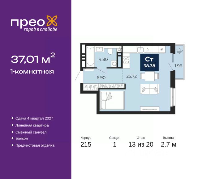 Продается 1-комн. квартира с предчистовой отделкой в ЖК "Прео" на 1 этаже. Общая площадь: 42.81 кв.м., жилая: 14.34 кв.м., площадь просторной кухни-столовой: 14.13 кв.м. Все окна выходят на одну сторону. В квартире один совмещенный санузел. Высота потолков 2.7 м. Дом монолитный, двухподъездный, переменной этажности, от 12 до 20 этажей. Квартира находится во 2-й секции высотой 20 этажей в корпусе 214. На этаже 8 квартир. В подъезде 1 пассажирский и 1 грузовой лифт. Окончание строительства - 4 квартал 2027 года. Оформление сделки по договору долевого участия. Преображенский — один из самых привлекательных районов для жизни! Это полностью самостоятельный жилой район с точки зрения инфраструктуры. Преображенский находится между Московским и Червишевским трактами в квартале улиц Закалужская — Вьюжная — Александра Протозанова. Не нужно ждать, когда появится инфраструктура — переезжайте на всё готовое. Вблизи расположены действующие школа и детский сад. В этом году откроется еще один сад, а в следующем году — школа. По соседству с Преображенским запланировано строительство городского парка "Комарово" площадью 38 гектар. За 10 минут можно доехать на автомобиле до крупных ТРЦ: "Лента", "Кристалл", "Леруа Мерлен", "Метро" и "Ашан". С 2018 года в районе открыт Соседский центр — пространство, созданное для формирования добрососедской среды, совместного досуга, общения и реализации соседских инициатив. Здесь проходят встречи соседей, а также сами жители района организовывают мероприятия. Организатором такого события может стать любой желающий. В квартирах выполнена качественная предчистовая отделка. Гладкие стены с финишным выравниванием по маякам. Ровный потолок для установки натяжного потолка. Установлены пятикамерные окна с двойным стеклопакетом (3 стекла). Дизайнерские холлы с видеонаблюдением, безбарьерным и прозрачным входом всегда светло и спокойно. На первом этаже есть просторные колясочные, где все жители могут оставлять свои коляски и велосипеды. В Преображенском есть всё, что нужно для активного отдыха и занятий спортом. Мы сделали большое футбольное поле с безопасным покрытием. Также установили хоккейный корт, который оборудован по всем необходимым стандартам. Во дворах можно делать упражнения на специальных площадках с турниками. Весь район мы обустроили велодорожками, которые связаны в единый маршрут. У нас есть сухие фонтаны, бьющие из земли, деревья, веревки, сетки, скалодром, газон, песок и резинка — осталось просто дать своему ребенку право на свободную игру. По-настоящему хорошие дворы — это те, которые дети предпочитают соцсетям и телевизору. Аккредитация в банках: ПАО "Банк Уралсиб", "Сбербанк России", ОАО "Альфа-Банк", ПАО Банк "ВТБ", ПАО "Газпромбанк" и других. #zmv92D