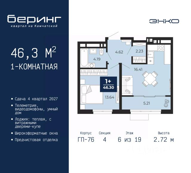 Успейте забронировать по акционной цене, период акции ограничен! Стоимость квартиры указана со скидкой, ваша экономия составит 561,371 руб. Информация по телефону, наши менеджеры вам все расскажут. 1-комн. квартира с предчистовой отделкой в ЖК "Беринг" на 9 этаже. Общая площадь: 38.26 кв.м., жилая: 12.95 кв.м., площадь просторной кухни-столовой: 15.48 кв.м. Все окна выходят на одну сторону. В квартире одна лоджия, один совмещенный санузел. Высота потолков 2.75 м. Дом монолитный, многоподъездный, переменной этажности, от 9 до 22 этажей. Квартира находится в 4-й секции высотой 12 этажей в корпусе ГП-73. На этаже 8 квартир. В подъезде 1 пассажирский и 1 грузовой лифт. Окончание строительства - 1 квартал 2026 года. Оформление сделки по договору долевого участия. Подобно знаменитому исследователю, мы чувствуем себя первооткрывателями этой локации. Хотим показать новую суть места, сформировать для вас жизненный опыт, которого ещё не было. Беринг — район зелёного цвета. Беринг — район, который откроется вам с другой стороны. Впечатлит новым уровнем комфорта и качеством жизни. Беринг — открытие на карте города. Первый квартал расположен в районе Тура, в границах улиц: Камчатская Западносибирская Энтузиастов. Вокруг уже есть всё для того, чтобы ежедневная рутина была лишь частью жизни и не доставляла дискомфорта. Школы и детские сады, магазины и аптеки, поликлиника, места для семейного отдыха, пеших и велопрогулок, и даже рыбалки. Масштабное озеленение дворов — визитная карточка ЭНКО и ваш оазис спокойствия, чтобы отвлечься от повседневности. Раскидистые деревья, кустарники, травы и цветы — осталось остановиться, вдохнуть и расслабиться, глядя на эту природную красоту. Стилистика подъездов продолжает концепцию Беринга, вдохновлённого Камчаткой: сдержанный, но при этом впечатляющий дизайн соседствует с удобством и функциональностью. #ZmDdgD 1-комнатная квартира с лоджией в Тюменской области.