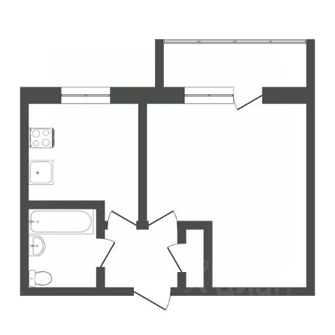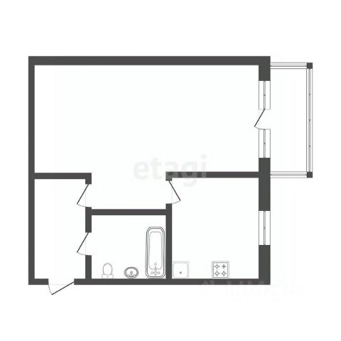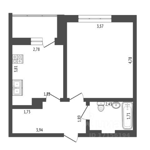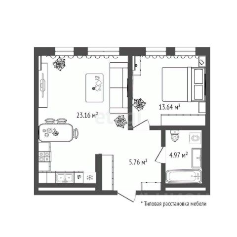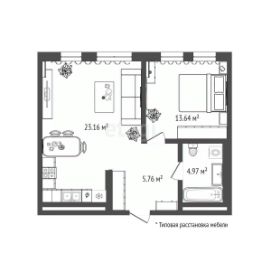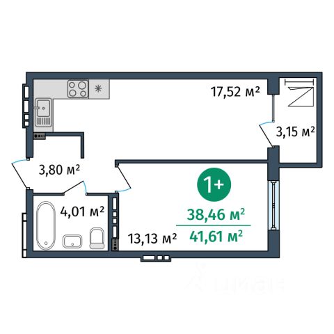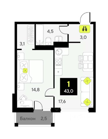 Квартира с кухней-гостиной и одной спальней в Доме у озера. Особенности планировки: балкон, предчистовая отделка.