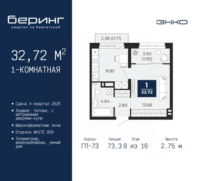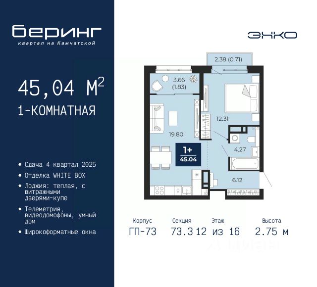 Просторная 1-комн. квартира в ЖК "Беринг" на 4 этаже. Квартира без отделки, полностью готова к ремонту. Общая площадь: 41.46 кв.м., жилая: 12.67 кв.м., площадь просторной кухни-столовой: 16.64 кв.м. Все окна выходят на одну сторону. В квартире одна лоджия, один совмещенный санузел. Высота потолков 2.75 м. Дом монолитный, многоподъездный, переменной этажности, от 9 до 21 этажей. Квартира находится в 4-й секции высотой 14 этажей в корпусе ГП-74. На этаже 7 квартир. В подъезде 1 пассажирский и 1 грузовой лифт. Окончание строительства - 4 квартал 2025 года. Оформление сделки по договору долевого участия. Подобно знаменитому исследователю, мы чувствуем себя первооткрывателями этой локации. Хотим показать новую суть места, сформировать для вас жизненный опыт, которого ещё не было. Беринг — район зелёного цвета. Беринг — район, который откроется вам с другой стороны. Впечатлит новым уровнем комфорта и качеством жизни. Беринг — открытие на карте города. Первый квартал расположен в районе Тура, в границах улиц: Камчатская Западносибирская Энтузиастов. Вокруг уже есть всё для того, чтобы ежедневная рутина была лишь частью жизни и не доставляла дискомфорта. Школы и детские сады, магазины и аптеки, поликлиника, места для семейного отдыха, пеших и велопрогулок, и даже рыбалки. Масштабное озеленение дворов — визитная карточка ЭНКО и ваш оазис спокойствия, чтобы отвлечься от повседневности. Раскидистые деревья, кустарники, травы и цветы — осталось остановиться, вдохнуть и расслабиться, глядя на эту природную красоту. Стилистика подъездов продолжает концепцию Беринга, вдохновлённого Камчаткой: сдержанный, но при этом впечатляющий дизайн соседствует с удобством и функциональностью. #zUsmZZ Продам 1-комнатную квартиру в микрорайоне Энтузиастов в городе Тюмень.