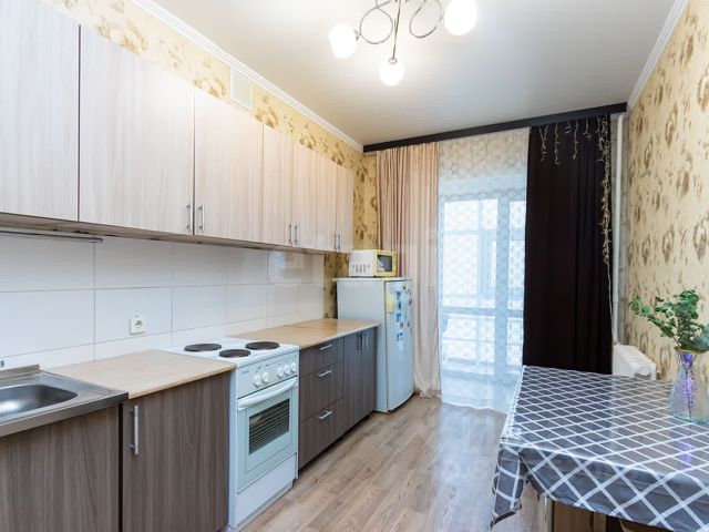 Ремонт 2015-2016 гг., на полу ламинат, на стенах обои, в санузле плитка, везде натянут натяжной потолок. В квартире остается кухонный гарнитур, плита, микроволновка, стол, табуретки, диван, кондиционер, огромный вместительный шкаф-купе с зеркалами. На данный момент в квартире никто не живет.