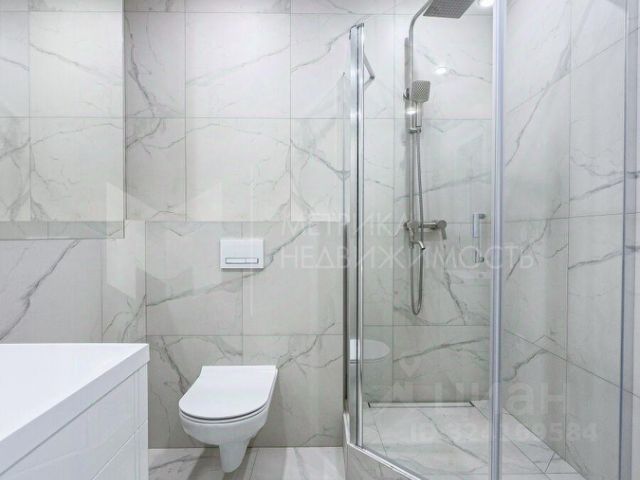 Ванная комната оснащена электрическим теплым полом, подвесной тумбой с накладной раковиной, ванной с душевой системой.
