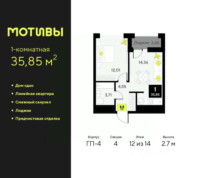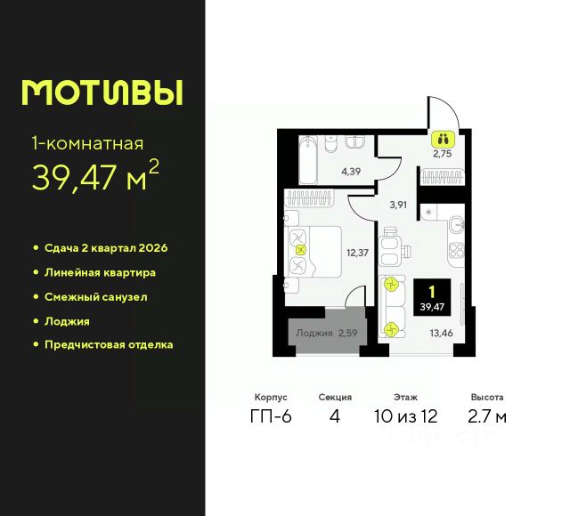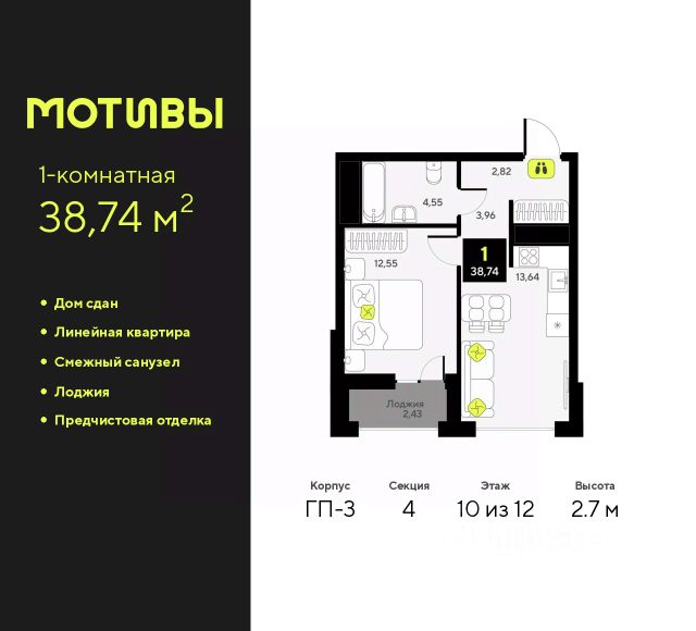 1-комн. квартира с предчистовой отделкой в ЖК "Мотивы" на 2 этаже. Общая площадь: 37.79 кв.м., жилая: 12.44 кв.м., площадь просторной кухни-столовой: 14.71 кв.м. Все окна выходят на одну сторону. В квартире одна лоджия, один совмещенный санузел. Высота потолков 2.7 м. Квартира будет сдаваться с предчистовой отделкой White Box: выровнены и оштукатурены стены, проведено электричество и отопление, установлены радиаторы. Вы также можете приобрести квартиру с ремонтом от застройщика, представленным в трех цветовых решениях Scandi, Wood и Coffee и включающим ламинат, обои под покраску, двери, натяжной потолок и санузел с сантехникой. При желании вы можете заказать отделку под ключ, варианты возможных решений представлены в альбоме фотографий. Дом монолитный, черырехподъездный, переменной этажности, от 12 до 14 этажей. Квартира находится во 2-й секции высотой 14 этажей в корпусе ГП-6. На этаже 12 квартир. В подъезде 1 пассажирский и 1 грузовой лифт. Окончание строительства - 2 квартал 2026 года. Оформление сделки по договору долевого участия. Закрытая от автомобилей территория, безопасный двор и камеры видеонаблюдения - гаранты вашего спокойствия. Квартал будет располагать богатой инфраструктурой: на первых этажах разместятся магазины, пекарни, кофейни, пункты выдачи, аптеки, детские центры, цветочные салоны и многое другое, что сделает жизнь поистине комфортной. Рядом находится парк общей площадью почти 5000 м², в котором располагаются локации для игр и отдыха жителей, здесь можно совершить утреннюю пробежку или прогуляться после рабочего дня. В парке есть зона воркаута с тренажерами для взрослых, игровые комплексы с горками и канатный комплекс для детей разных возрастов, качели и лавочки для отдыха, площадки для командных видов спорта и для панна-футбола. В ЖК "Мотивы" всё продумано до мелочей: светлые холлы входных групп, оформленные в едином стиле, просторные колясочные, лапомойки для питомцев. На территории комплекса находятся 2 8-ми этажных паркинга и более 1000 м/м на открытой парковке. Жилой комплекс находится в одном из экологически благоприятных районов Тюмени, недалеко от Плехановского бора. При этом до центра города можно добраться за 15 минут, а до международного аэропорта Рощино за 13 минут. Окончание строительства: ГП 1, 2, 3, 4 сдача до конца 2024 года, ГП 6, 7, 8 сдача 2 квартал 2026 года. #24A7dB