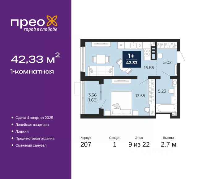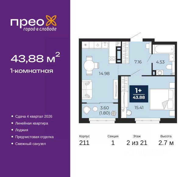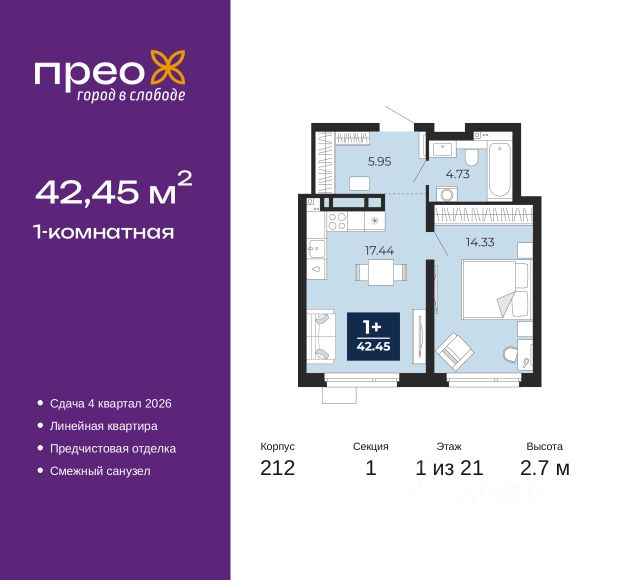 1-комн. квартира от застройщика с предчистовой отделкой в ЖК "Прео" на 2 этаже. Общая площадь: 41.79 кв.м., жилая: 17.67 кв.м., площадь просторной кухни-столовой: 12.3 кв.м. Все окна выходят на одну сторону. В квартире один балкон, один совмещенный санузел. Высота потолков 2.7 м. Дом монолитный, черырехподъездный, переменной этажности, от 14 до 21 этажей. Квартира находится во 2-й секции высотой 21 этаж в корпусе 211. На этаже 10 квартир. В подъезде 1 пассажирский и 1 грузовой лифт. Окончание строительства - 4 квартал 2026 года. Оформление сделки по договору долевого участия. Преображенский — один из самых привлекательных районов для жизни! Это полностью самостоятельный жилой район с точки зрения инфраструктуры. Преображенский находится между Московским и Червишевским трактами в квартале улиц Закалужская — Вьюжная — Александра Протозанова. Не нужно ждать, когда появится инфраструктура — переезжайте на всё готовое. Вблизи расположены действующие школа и детский сад. В этом году откроется еще один сад, а в следующем году — школа. По соседству с Преображенским запланировано строительство городского парка "Комарово" площадью 38 гектар. За 10 минут можно доехать на автомобиле до крупных ТРЦ: "Лента", "Кристалл", "Леруа Мерлен", "Метро" и "Ашан". С 2018 года в районе открыт Соседский центр — пространство, созданное для формирования добрососедской среды, совместного досуга, общения и реализации соседских инициатив. Здесь проходят встречи соседей, а также сами жители района организовывают мероприятия. Организатором такого события может стать любой желающий. В квартирах выполнена качественная предчистовая отделка. Гладкие стены с финишным выравниванием по маякам. Ровный потолок для установки натяжного потолка. Установлены пятикамерные окна с двойным стеклопакетом (3 стекла). Дизайнерские холлы с видеонаблюдением, безбарьерным и прозрачным входом всегда светло и спокойно. На первом этаже есть просторные колясочные, где все жители могут оставлять свои коляски и велосипеды. В Преображенском есть всё, что нужно для активного отдыха и занятий спортом. Мы сделали большое футбольное поле с безопасным покрытием. Также установили хоккейный корт, который оборудован по всем необходимым стандартам. Во дворах можно делать упражнения на специальных площадках с турниками. Весь район мы обустроили велодорожками, которые связаны в единый маршрут. У нас есть сухие фонтаны, бьющие из земли, деревья, веревки, сетки, скалодром, газон, песок и резинка — осталось просто дать своему ребенку право на свободную игру. По-настоящему хорошие дворы — это те, которые дети предпочитают соцсетям и телевизору. Аккредитация в банках: ПАО "Газпромбанк", ПАО "Банк Уралсиб", "Сбербанк России", ОАО "Альфа-Банк", ПАО Банк "ВТБ" и других. #zSOas9 Продам 1-комнатную квартиру на улице Арктическая в городе Тюмень.