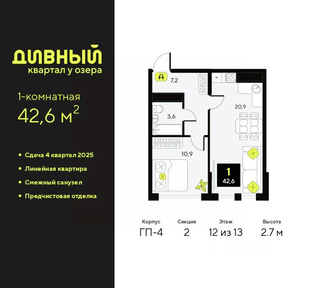 Просторная однокомнатная квартира с предчистовой отделкой в ЖК "Дивный квартал у озера" на 2 этаже. Общая площадь: 43.7 кв.м., жилая: 11.2 кв.м., площадь просторной кухни-столовой: 21.9 кв.м. Все окна выходят на одну сторону. В квартире один совмещенный санузел. Высота потолков 2.7 м. Квартира будет сдаваться с предчистовой отделкой White Box: выровнены и оштукатурены стены, проведено электричество и отопление, установлены радиаторы. Вы также можете приобрести квартиру с ремонтом от застройщика, представленным в трех цветовых решениях Scandi, Wood и Coffee и включающим: ламинат, обои под покраску, двери, натяжной потолок, санузел с сантехникой. При желании вы можете заказать отделку под ключ, варианты возможных решений представлены в альбоме фотографий. Дом монолитный, трехподъездный, переменной этажности, от 9 до 17 этажей. Квартира находится в 3-й секции высотой 9 этажей в корпусе ГП-6. На этаже 5 квартир. В подъезде 1 пассажирский и 1 грузовой лифт. Окончание строительства - 4 квартал 2025 года. Оформление сделки по договору долевого участия. "Дивный квартал у озера" современный жилой квартал, удобно расположенный в 10-ти минутах от центра Тюмени, в уютном районе рядом с зеленым массивом и озером Алебашево. Комплекс находится между улицами Мельникайте и Алебашевская, что обеспечивает его хорошую транспортную доступность до центра на автомобиле всего 10 минут. Рядом с комплексом расположен Лесопарк имени Гагарина, экзотический Парк дружбы между Россией и Республикой Корея. "Дивный квартал у озера" объединяет архитектуру современной городской застройки и природную эстетику. Уютные дворы жилого комплекса будут не только безопасными, но и тихими. Закрытая территория надёжно защищена от шума и посторонних глаз. Здесь будут места для отдыха, детские площадки, зоны для выгула собак. В холлах первого этажа расположены мягкая зона ожидания, общественные санузлы и просторная колясочная. Квартал будет располагать богатой инфраструктурой: на первых этажах домов разместятся магазины, пекарни, кофейни, пункты выдачи, аптеки, детские центры, цветочные салоны и многое другое, что сделает жизнь поистине комфортной. В комплексе есть теплый подземный паркинг и кладовые. #269b0c