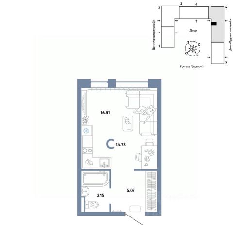 Продается студия в новом микрорайоне "Домашний" в районе Московского тракта рядом с ТРЦ "Колумб". Общая площадь квартиры 20,91 кв. м. Сдача — в 4 квартале 2024 года. О ПРОЕКТЕ Микрорайон "Домашний" — это 6 очередей строительства, 24 дома переменной этажности. Каждый дом уникальный. Внутри микрорайона появится огромный пешеходный бульвар — бульвар Традиций. Центром притяжения станут открытые пространства для отдыха жителей и гостей микрорайона, которые легко меняются под сезонные сценарии отдыха: новогодняя елка, ярмарки, кинопоказы и т.д. У каждого дома обустроен приватный двор с зонами для активного и спокойного отдыха. В активной зоне детские разновозрастные площадки с горками, песочницами и качелями, воркаут-зоны. В спокойной — скамейки, мини-амфитеатры, закрытые перголы. Уютной атмосферу сделает обильное озеленение и освещение "домашними" торшерами. ОТДЕЛКА Квартиры сдаются с предчистовой отделкой. Все грязные работы выполнены: произведена разводка электричества и отопления; выполнена стяжка пола; стены выровнены "под маяк". В квартире установлены розетки, выключатели и радиаторы. На входе — надежная стальная дверь. Вам остается только выбрать материалы и начать ремонт Доступна опция "Ремонт от застройщика". Стоимость можно включить в ипотеку. Вы можете заказать один из трех цветовых вариантов: светлый, натуральный или тёмный. В квартире внедрена технология "Умный дом". КУХНЯ С ТЕХНИКОЙ Теперь дополнительно к ремонту можно заказать кухню со встроенной техникой. Эргономику и функциональное наполнение разработали под каждую планировку. ПОЛНАЯ МЕБЛИРОВКА Больше не нужно тратить время даже на подбор, доставку и сборку мебели.Вы можете включить в стоимость квартиры с ремонтом полную меблировку. - Что входит в меблировку? - Кухня с техникой и сантехникой - Диван - Кровать - Шкаф в спальне - Шкаф в прихожей Цены на квартиры указаны без учета скидок. На консультации менеджер подскажет, какие акции действуют, и как получить одобрение по ипотеке с низкой ставкой. Более подробная информация по телефону. Продам 1-комнатную квартиру на улице Новоселов в городе Тюмень.