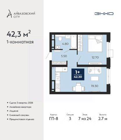 Однокомнатная квартира от застройщика с предчистовой отделкой в ЖК "Айвазовский City" на 18 этаже. Общая площадь: 59.7 кв.м., жилая: 11.6 кв.м., площадь просторной кухни-столовой: 28.2 кв.м. Угловая квартира, идеально подойдет любителям тишины и панорамных видов. В квартире одна лоджия, один совмещенный санузел. Высота потолков 2.72 м. Дом монолитный, многоподъездный, переменной этажности, от 9 до 24 этажей. Квартира находится в 3-й секции высотой 18 этажей в корпусе ГП-7. На этаже 5 квартир. В подъезде 1 пассажирский и 2 грузовых лифта. Окончание строительства - 3 квартал 2026 года. Оформление сделки по договору долевого участия. Новый жилой район располагается в живописном месте на берегу Туры в центральной части города. Принципиально новое пространство для жизни в центре современного города для тех, чьи мечты сбываются, кто нацелен на постоянный рост, перемены к лучшему для себя и своих близких. Каждая деталь Айвазовский City вдохновляет и заряжает на новые свершения: авторская архитектура, сбалансированная продуманная инфраструктура, дизайнерские дворы со спортивными и детскими площадками, парковые зоны с фонтанами, водный канал, украшающий центральный прогулочный маршрут района и многое другое. В 2019 года проект стал лауреатом престижной премии Urban Awards 2019 в номинации "Лучший строящийся региональный жилой комплекс бизнес-класса". Главная особенность Айвазовский City - соседство разных архитектурных школ в рамках одного дома. Изысканная классика, выразительная эклектика и оригинальный модерн - жить в одном из таких домов настоящий повод для гордости. Айвазовский City это идеальное сочетание комфорта, технологий и развитой инфраструктуры. Вход в подъезд возможен с улицы и со двора. Отправляясь на работу или за покупками, жители могут выйти с внешней стороны дома, а для прогулки с ребенком со стороны двора. Экологически чистые материалы и энергосберегающие технологии, качественное освещение общественных зон, видеонаблюдение по всей территории жилого района (в том числе в подъездах, лифтах и в подземном паркинге), закрытые дворы с доступом только для жителей Айвазовский City. Часть домов в Айвазовский City будут оснащены подземным паркингом. Востребованный в нашем климатическом поясе формат хранения автомобилей защитит собственность владельца в любое время года. Аккредитация в банках: ОАО "Альфа-Банк", ПАО Банк "ВТБ", ПАО "Газпромбанк", "Сбербанк России", АО "ДОМ.РФ" и других. #2SfM9b Продается 1-комнатная квартира на улице Пожарных и Спасателей в городе Тюмень.