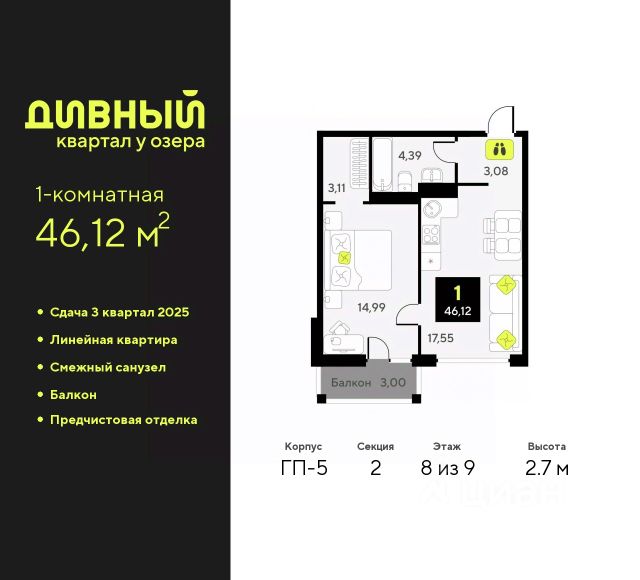 1-комн. квартира с предчистовой отделкой в ЖК "Дивный квартал у озера" на 7 этаже. Общая площадь: 38.82 кв.м., жилая: 14.48 кв.м., площадь просторной кухни-столовой: 11.41 кв.м. Все окна выходят на одну сторону. В квартире одна лоджия, один совмещенный санузел. Высота потолков 2.7 м. Квартира будет сдаваться с предчистовой отделкой White Box: выровнены и оштукатурены стены, проведено электричество и отопление, установлены радиаторы. Вы также можете приобрести квартиру с ремонтом от застройщика, представленным в трех цветовых решениях Scandi, Wood и Coffee и включающим: ламинат, обои под покраску, двери, натяжной потолок, санузел с сантехникой. При желании вы можете заказать отделку под ключ, варианты возможных решений представлены в альбоме фотографий. Дом монолитный, черырехподъездный, переменной этажности, от 7 до 9 этажей. Квартира находится в 1-й секции высотой 7 этажей в корпусе ГП-5. На этаже 9 квартир. В подъезде 1 грузовой лифт. Окончание строительства - 4 квартал 2025 года. Оформление сделки по договору долевого участия. "Дивный квартал у озера" современный жилой квартал, удобно расположенный в 10-ти минутах от центра Тюмени, в уютном районе рядом с зеленым массивом и озером Алебашево. Комплекс находится между улицами Мельникайте и Алебашевская, что обеспечивает его хорошую транспортную доступность до центра на автомобиле всего 10 минут. Рядом с комплексом расположен Лесопарк имени Гагарина, экзотический Парк дружбы между Россией и Республикой Корея. "Дивный квартал у озера" объединяет архитектуру современной городской застройки и природную эстетику. Уютные дворы жилого комплекса будут не только безопасными, но и тихими. Закрытая территория надёжно защищена от шума и посторонних глаз. Здесь будут места для отдыха, детские площадки, зоны для выгула собак. В холлах первого этажа расположены мягкая зона ожидания, общественные санузлы и просторная колясочная. Квартал будет располагать богатой инфраструктурой: на первых этажах домов разместятся магазины, пекарни, кофейни, пункты выдачи, аптеки, детские центры, цветочные салоны и многое другое, что сделает жизнь поистине комфортной. В комплексе есть теплый подземный паркинг и кладовые. #ZWA8dd