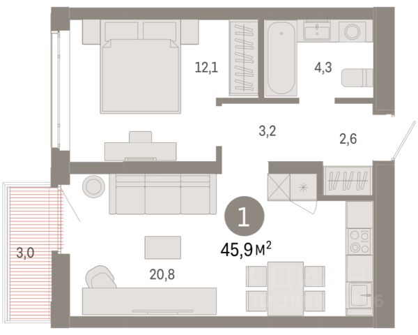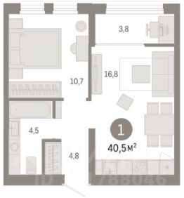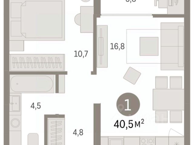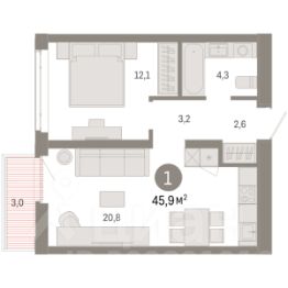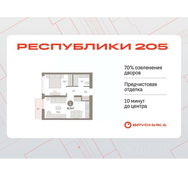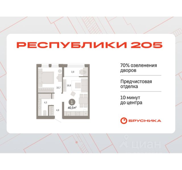 Продается 1-комн. квартира с предчистовой отделкой в ЖК "Республики 205" на 9 этаже. Общая площадь: 40.46 кв.м., жилая: 10.7 кв.м., площадь просторной кухни-гостиной: 16.7 кв.м. Все окна выходят на одну сторону. В квартире одна лоджия, один совмещенный санузел. Высота потолков 2.6 м.