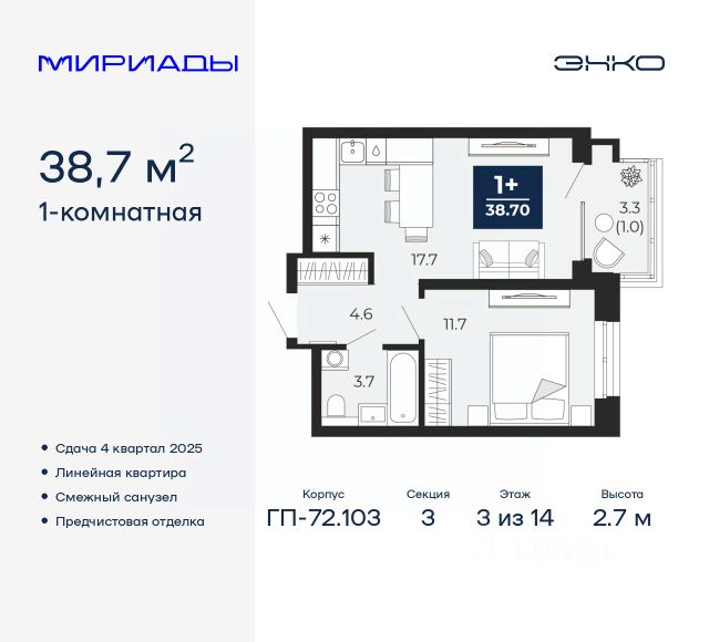 Продается 1-комн. квартира от застройщика с предчистовой отделкой в ЖК "Мириады" на 2 этаже. Общая площадь: 40.1 кв.м., жилая: 14 кв.м., площадь просторной кухни-столовой: 15.2 кв.м. Все окна выходят на одну сторону. В квартире два балкона, один совмещенный санузел. Высота потолков 2.7 м. Дом монолитный, трехподъездный, переменной этажности, от 14 до 16 этажей. Квартира находится в 1-й секции высотой 16 этажей в корпусе ГП-72.103. На этаже 8 квартир. В подъезде 1 пассажирский и 1 грузовой лифт. Окончание строительства - 4 квартал 2025 года. Оформление сделки по договору долевого участия. Вселенная бесконечных историй. Ранее невиданный Тюмени масштаб: территория 240 гектаров и 1 650 000 м² застройки. Мириады это город масштабных перемен и больших возможностей. Город зеленых рощ и зеркальных озер. Город для работы, учебы и развлечений. Город для детей и их родителей. Город для всех и каждого. Проект расположен в районе Мыс рядом с ТРЦ "Тюмень Сити Молл" в границах улицы Тимофея Чаркова, Тобольского тракта и объездной дороги. Срок полного освоения территории - до 2034 года. #zmveaz Купить 1-комнатную квартиру на улице Тимофея Чаркова в городе Тюмень.