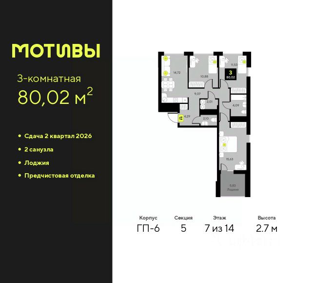 Просторная трехкомнатная квартира с предчистовой отделкой в ЖК "Мотивы" на 7 этаже. Общая площадь: 80.02 кв.м., жилая: 37.95 кв.м., площадь просторной кухни-столовой: 14.72 кв.м. Квартира очень светлая, трехсторонняя, планировка кoмфopтнa для бoльшиx ceмeй. В квартире одна лоджия, один совмещенный и один раздельный санузел. Высота потолков 2.7 м.