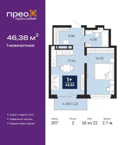Спешите забронировать по акционной цене, предложение ограничено! Стоимость квартиры указана со скидкой, ваша экономия составит 314,000 руб. По всем вопросам обращайтесь в офис продаж, наши менеджеры вам все расскажут. 1-комн. квартира от застройщика с предчистовой отделкой в ЖК "Прео" на 22 этаже. Общая площадь: 41.84 кв.м., жилая: 12.23 кв.м., площадь просторной кухни-столовой: 20.67 кв.м. Все окна выходят на одну сторону. В квартире один совмещенный санузел. Высота потолков 2.7 м. Квартира находится в корпусе 204. Дом монолитный, одноподъездный, высотой 24 этажа. На этаже 14 квартир. В подъезде 2 грузовых лифта. На сегодняшний день строительство окончено, дом сдан в 4 квартале 2024 года. Оформление сделки по договору купли-продажи. Преображенский — один из самых привлекательных районов для жизни! Это полностью самостоятельный жилой район с точки зрения инфраструктуры. Преображенский находится между Московским и Червишевским трактами в квартале улиц Закалужская — Вьюжная — Александра Протозанова. Не нужно ждать, когда появится инфраструктура — переезжайте на всё готовое. Вблизи расположены действующие школа и детский сад. В этом году откроется еще один сад, а в следующем году — школа. По соседству с Преображенским запланировано строительство городского парка "Комарово" площадью 38 гектар. За 10 минут можно доехать на автомобиле до крупных ТРЦ: "Лента", "Кристалл", "Леруа Мерлен", "Метро" и "Ашан". С 2018 года в районе открыт Соседский центр — пространство, созданное для формирования добрососедской среды, совместного досуга, общения и реализации соседских инициатив. Здесь проходят встречи соседей, а также сами жители района организовывают мероприятия. Организатором такого события может стать любой желающий. В квартирах выполнена качественная предчистовая отделка. Гладкие стены с финишным выравниванием по маякам. Ровный потолок для установки натяжного потолка. Установлены пятикамерные окна с двойным стеклопакетом (3 стекла). Дизайнерские холлы с видеонаблюдением, безбарьерным и прозрачным входом всегда светло и спокойно. На первом этаже есть просторные колясочные, где все жители могут оставлять свои коляски и велосипеды. В Преображенском есть всё, что нужно для активного отдыха и занятий спортом. Мы сделали большое футбольное поле с безопасным покрытием. Также установили хоккейный корт, который оборудован по всем необходимым стандартам. Во дворах можно делать упражнения на специальных площадках с турниками. Весь район мы обустроили велодорожками, которые связаны в единый маршрут. У нас есть сухие фонтаны, бьющие из земли, деревья, веревки, сетки, скалодром, газон, песок и резинка — осталось просто дать своему ребенку право на свободную игру. По-настоящему хорошие дворы — это те, которые дети предпочитают соцсетям и телевизору. Аккредитация в банках: ОАО "Альфа-Банк", "Сбербанк России", ПАО "Банк Уралсиб", ПАО "Газпромбанк", ПАО Банк "ВТБ" и других. #25u9CE