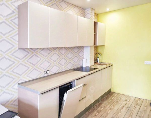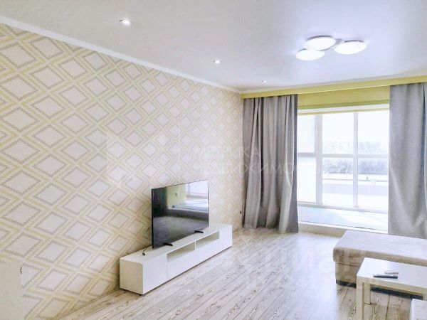 Просторная кухня правильной формы, гостиная 17, м² с окнами на две стороны и выходом на лоджию.