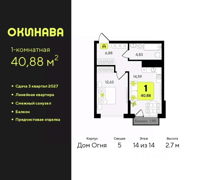 Дом монолитный, многоподъездный, переменной этажности, от 13 до 19 этажей. Квартира находится в 3-й секции высотой 19 этажей в корпусе Дом Огня. На этаже 11 квартир. В подъезде 1 пассажирский и 1 грузовой лифт. Окончание строительства - 3 квартал 2027 года. Оформление сделки по договору долевого участия.