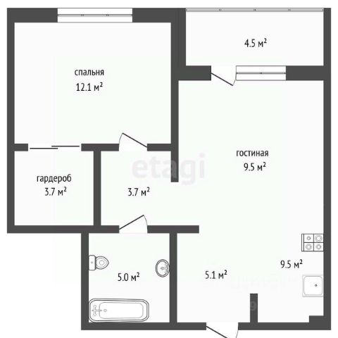 Светлая, просторная квартира расположенная на 4-м этаже состоящая из спальни площадью 13,59 кв.м., гостиной 16,28 кв.м., и следующих вспомогательных помещений: кухня площадью 7,96 кв.м. (кухня не отделена внутренней перегородкой от гостиной), совмещённый санузел площадью 4,86 кв.м., коридор площадью 8,88 кв.м., а также лоджии площадью 2,08 кв.м. (с учётом понижающего коэффициента 0,5).