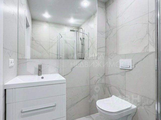 Ванная комната оснащена электрическим теплым полом, подвесной тумбой с накладной раковиной, ванной с душевой системой.
