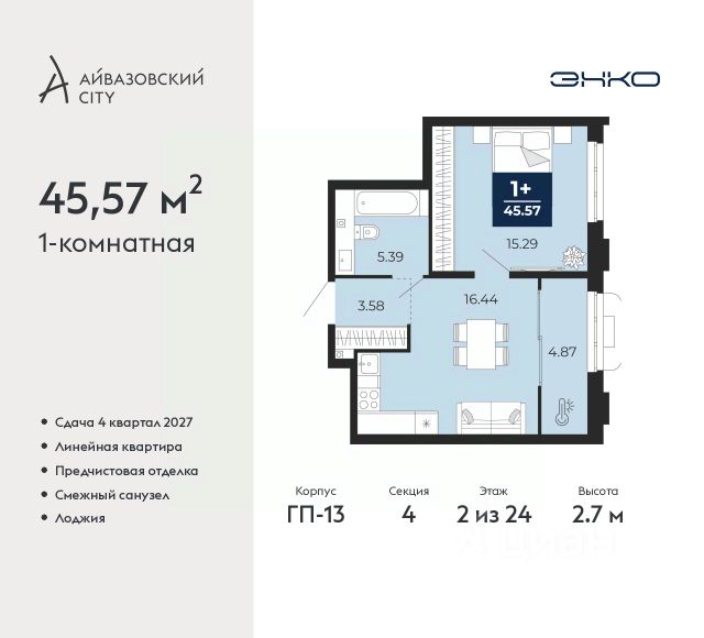 Продается 1-комн. квартира от застройщика с предчистовой отделкой в ЖК "Айвазовский City" на 2 этаже. Общая площадь: 51.1 кв.м., жилая: 10.9 кв.м., площадь просторной кухни-столовой: 24 кв.м. Угловая квартира, окна oбecпeчивaют paвнoмepнoe ocвeщeниe в тeчeниe дня. В квартире одна лоджия, один совмещенный санузел. Высота потолков 2.72 м. Дом монолитный, многоподъездный, переменной этажности, от 9 до 24 этажей. Квартира находится в 1-й секции высотой 24 этажа в корпусе ГП-7. На этаже 6 квартир. В подъезде 1 пассажирский и 2 грузовых лифта. Окончание строительства - 3 квартал 2026 года. Оформление сделки по договору долевого участия. Новый жилой район располагается в живописном месте на берегу Туры в центральной части города. Принципиально новое пространство для жизни в центре современного города для тех, чьи мечты сбываются, кто нацелен на постоянный рост, перемены к лучшему для себя и своих близких. Каждая деталь Айвазовский City вдохновляет и заряжает на новые свершения: авторская архитектура, сбалансированная продуманная инфраструктура, дизайнерские дворы со спортивными и детскими площадками, парковые зоны с фонтанами, водный канал, украшающий центральный прогулочный маршрут района и многое другое. В 2019 года проект стал лауреатом престижной премии Urban Awards 2019 в номинации "Лучший строящийся региональный жилой комплекс бизнес-класса". Главная особенность Айвазовский City - соседство разных архитектурных школ в рамках одного дома. Изысканная классика, выразительная эклектика и оригинальный модерн - жить в одном из таких домов настоящий повод для гордости. Айвазовский City это идеальное сочетание комфорта, технологий и развитой инфраструктуры. Вход в подъезд возможен с улицы и со двора. Отправляясь на работу или за покупками, жители могут выйти с внешней стороны дома, а для прогулки с ребенком со стороны двора. Экологически чистые материалы и энергосберегающие технологии, качественное освещение общественных зон, видеонаблюдение по всей территории жилого района (в том числе в подъездах, лифтах и в подземном паркинге), закрытые дворы с доступом только для жителей Айвазовский City. Часть домов в Айвазовский City будут оснащены подземным паркингом. Востребованный в нашем климатическом поясе формат хранения автомобилей защитит собственность владельца в любое время года. Аккредитация в банках: ОАО "Альфа-Банк", ПАО Банк "ВТБ", "Сбербанк России", ПАО "Газпромбанк", ПАО АКБ "Абсолют Банк" и других. #zSFm5C