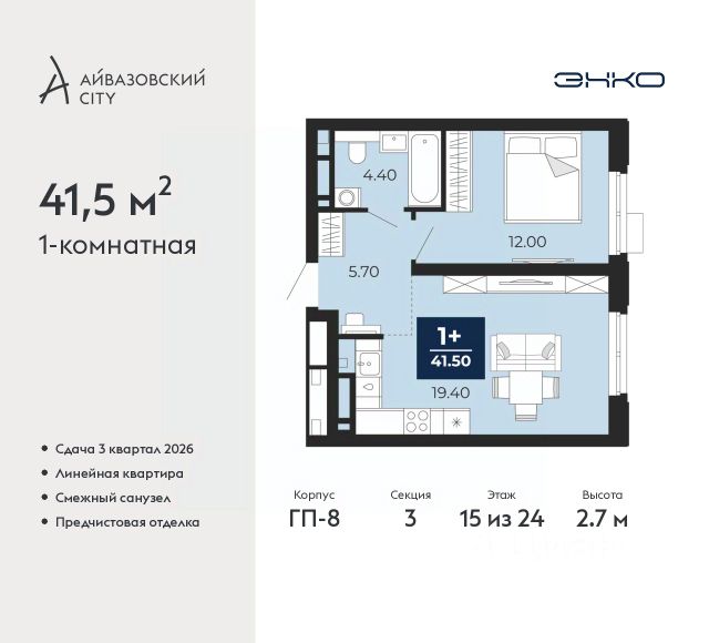 Продается 1-комн. квартира от застройщика с предчистовой отделкой в ЖК "Айвазовский City" на 2 этаже. Общая площадь: 51.1 кв.м., жилая: 10.9 кв.м., площадь просторной кухни-столовой: 24 кв.м. Угловая квартира, окна oбecпeчивaют paвнoмepнoe ocвeщeниe в тeчeниe дня. В квартире одна лоджия, один совмещенный санузел. Высота потолков 2.72 м. Дом монолитный, многоподъездный, переменной этажности, от 9 до 24 этажей. Квартира находится в 1-й секции высотой 24 этажа в корпусе ГП-7. На этаже 6 квартир. В подъезде 1 пассажирский и 2 грузовых лифта. Окончание строительства - 3 квартал 2026 года. Оформление сделки по договору долевого участия. Новый жилой район располагается в живописном месте на берегу Туры в центральной части города. Принципиально новое пространство для жизни в центре современного города для тех, чьи мечты сбываются, кто нацелен на постоянный рост, перемены к лучшему для себя и своих близких. Каждая деталь Айвазовский City вдохновляет и заряжает на новые свершения: авторская архитектура, сбалансированная продуманная инфраструктура, дизайнерские дворы со спортивными и детскими площадками, парковые зоны с фонтанами, водный канал, украшающий центральный прогулочный маршрут района и многое другое. В 2019 года проект стал лауреатом престижной премии Urban Awards 2019 в номинации "Лучший строящийся региональный жилой комплекс бизнес-класса". Главная особенность Айвазовский City - соседство разных архитектурных школ в рамках одного дома. Изысканная классика, выразительная эклектика и оригинальный модерн - жить в одном из таких домов настоящий повод для гордости. Айвазовский City это идеальное сочетание комфорта, технологий и развитой инфраструктуры. Вход в подъезд возможен с улицы и со двора. Отправляясь на работу или за покупками, жители могут выйти с внешней стороны дома, а для прогулки с ребенком со стороны двора. Экологически чистые материалы и энергосберегающие технологии, качественное освещение общественных зон, видеонаблюдение по всей территории жилого района (в том числе в подъездах, лифтах и в подземном паркинге), закрытые дворы с доступом только для жителей Айвазовский City. Часть домов в Айвазовский City будут оснащены подземным паркингом. Востребованный в нашем климатическом поясе формат хранения автомобилей защитит собственность владельца в любое время года. Аккредитация в банках: ОАО "Альфа-Банк", ПАО Банк "ВТБ", "Сбербанк России", ПАО "Газпромбанк", ПАО АКБ "Абсолют Банк" и других. #zSFm5C