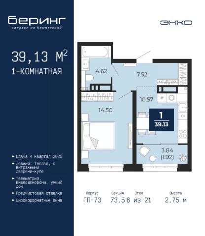 Продается однокомнатная квартира с предчистовой отделкой в ЖК "Беринг" на 13 этаже. Общая площадь: 38.15 кв.м., жилая: 9.87 кв.м., площадь просторной кухни-столовой: 15.36 кв.м. Все окна выходят на одну сторону. В квартире один балкон, один совмещенный санузел. Высота потолков 2.72 м. Дом монолитный, многоподъездный, переменной этажности, от 17 до 24 этажей. Квартира находится во 2-й секции высотой 19 этажей в корпусе ГП-75. На этаже 7 квартир. В подъезде 2 пассажирских и 1 грузовой лифт. Окончание строительства - 4 квартал 2027 года. Оформление сделки по договору долевого участия. Подобно знаменитому исследователю, мы чувствуем себя первооткрывателями этой локации. Хотим показать новую суть места, сформировать для вас жизненный опыт, которого ещё не было. Беринг — район зелёного цвета. Беринг — район, который откроется вам с другой стороны. Впечатлит новым уровнем комфорта и качеством жизни. Беринг — открытие на карте города. Первый квартал расположен в районе Тура, в границах улиц: Камчатская Западносибирская Энтузиастов. Вокруг уже есть всё для того, чтобы ежедневная рутина была лишь частью жизни и не доставляла дискомфорта. Школы и детские сады, магазины и аптеки, поликлиника, места для семейного отдыха, пеших и велопрогулок, и даже рыбалки. Масштабное озеленение дворов — визитная карточка ЭНКО и ваш оазис спокойствия, чтобы отвлечься от повседневности. Раскидистые деревья, кустарники, травы и цветы — осталось остановиться, вдохнуть и расслабиться, глядя на эту природную красоту. Стилистика подъездов продолжает концепцию Беринга, вдохновлённого Камчаткой: сдержанный, но при этом впечатляющий дизайн соседствует с удобством и функциональностью. #26g9Ie
