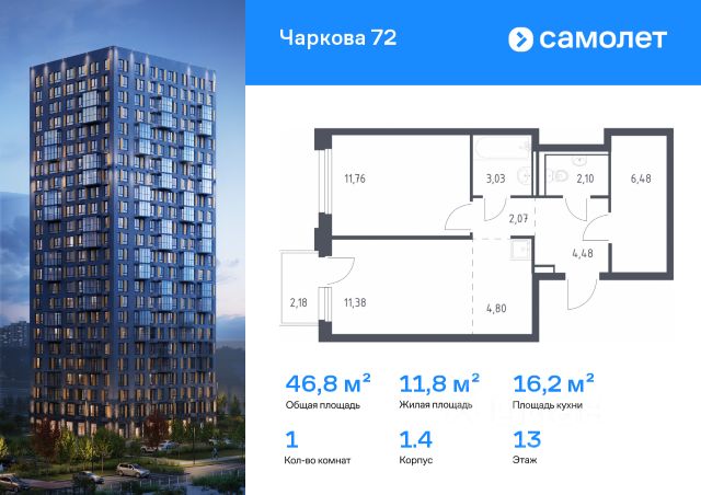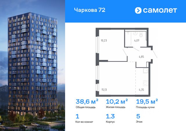 Строим кварталы для жизни с заботой о будущем. Предлагается 1-комнатная квартира комфорт-класса 38,63 кв.м в корпусе 1.3 на 5 этаже, в ЖК "Чаркова 72" Квартира с предчистовой отделкой. Доступность дополнительных опций уточняйте у застройщика. Приобрести квартиру возможно по специальным акциям от застройщика, с текущими условиями акций можно ознакомиться в блоке "Акций". Цена динамическая и может отличаться, уточняйте актуальность у застройщика. Идеальное сочетание городского комфорта и размеренной жизни — квартал "Чаркова 72" на северо-востоке города. В дизайне 17-24-этажных домов с панорамными балконами нашли отражение нотки сибирской природы. От "Чаркова 72" удобно добираться до центра города — всего 17 минут пути. А в 2 минутах от дома находится Тобольский тракт. Для семейного отдыха отлично подойдет парк Гагарина — он находится в 7 минутах от квартала. В закрытых дворах тихо и уютно — все авто остались на одном из 4 многоуровневых паркингов, которые находятся за территорией квартала. Можно спокойно гулять по бульвару и заниматься йогой на спортивной площадке. На первых этажах домов — кафе и магазины. Рядом с проектом — детские сады и школы, городская поликлиника и МФЦ. Во всех квартирах есть выводы под кондиционеры, на подземных этажах — индивидуальные кладовые, на первых — места для хранения велосипедов и колясок. В квартирах можно выбрать варианты отделки: чистовая, черновая и улучшенная из материалов повышенного класса.