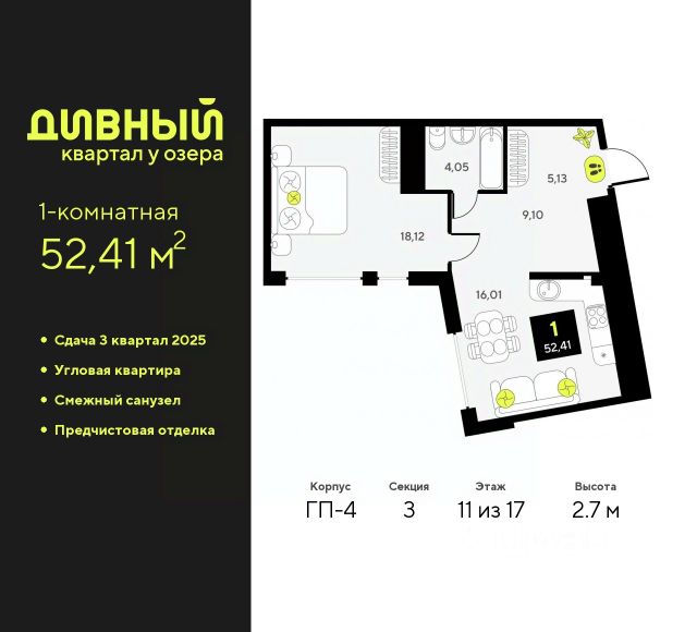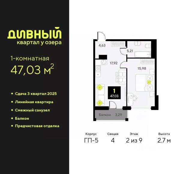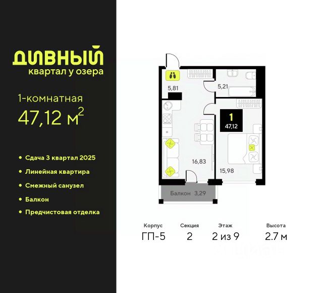 Продается 1-комн. квартира от застройщика с предчистовой отделкой в ЖК "Дивный квартал у озера" на 2 этаже. Общая площадь: 43.98 кв.м., жилая: 11.36 кв.м., площадь просторной кухни-столовой: 21.96 кв.м. Все окна выходят на одну сторону. В квартире один совмещенный санузел. Высота потолков 2.7 м. Квартира будет сдаваться с предчистовой отделкой White Box: выровнены и оштукатурены стены, проведено электричество и отопление, установлены радиаторы. Вы также можете приобрести квартиру с ремонтом от застройщика, представленным в трех цветовых решениях Scandi, Wood и Coffee и включающим: ламинат, обои под покраску, двери, натяжной потолок, санузел с сантехникой. При желании вы можете заказать отделку под ключ, варианты возможных решений представлены в альбоме фотографий. Дом монолитный, трехподъездный, переменной этажности, от 9 до 17 этажей. Квартира находится в 3-й секции высотой 9 этажей в корпусе ГП-6. На этаже 5 квартир. В подъезде 1 пассажирский и 1 грузовой лифт. Окончание строительства - 4 квартал 2025 года. Оформление сделки по договору долевого участия. "Дивный квартал у озера" современный жилой квартал, удобно расположенный в 10-ти минутах от центра Тюмени, в уютном районе рядом с зеленым массивом и озером Алебашево. Комплекс находится между улицами Мельникайте и Алебашевская, что обеспечивает его хорошую транспортную доступность до центра на автомобиле всего 10 минут. Рядом с комплексом расположен Лесопарк имени Гагарина, экзотический Парк дружбы между Россией и Республикой Корея. "Дивный квартал у озера" объединяет архитектуру современной городской застройки и природную эстетику. Уютные дворы жилого комплекса будут не только безопасными, но и тихими. Закрытая территория надёжно защищена от шума и посторонних глаз. Здесь будут места для отдыха, детские площадки, зоны для выгула собак. В холлах первого этажа расположены мягкая зона ожидания, общественные санузлы и просторная колясочная. Квартал будет располагать богатой инфраструктурой: на первых этажах домов разместятся магазины, пекарни, кофейни, пункты выдачи, аптеки, детские центры, цветочные салоны и многое другое, что сделает жизнь поистине комфортной. В комплексе есть теплый подземный паркинг и кладовые. #Z4AVdu