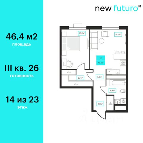 Продаётся 1-комнатная квартира в строящемся доме (Дом 6к1), срок сдачи: III-кв. 2026, общей площадью 46.4 кв.м., на 12 этаже. Новый жилой комплекс "Futuro" от застройщика "newton" расположен в г. Тюмень на Ставропольской улице.