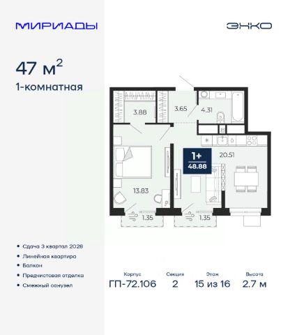 Успейте оформить бронирование, пока действует скидка! Период предложения ограничен! Стоимость квартиры указана со скидкой, ваша экономия составит 335,000 RUB. Информация по телефону, наши менеджеры вам все расскажут! 1-комн. квартира от застройщика с предчистовой отделкой в ЖК "Мириады" на 8 этаже. Общая площадь: 43.05 кв.м., жилая: 10.22 кв.м., площадь просторной кухни-столовой: 17.47 кв.м. Все окна выходят на одну сторону. В квартире один балкон, два совмещенных санузла. Высота потолков 2.7 м. Дом монолитный, двухподъездный, переменной этажности, от 14 до 16 этажей. Квартира находится во 2-й секции высотой 16 этажей в корпусе ГП-72.107. На этаже 10 квартир. В подъезде 1 пассажирский и 1 грузовой лифт. Окончание строительства - 3 квартал 2028 года. Оформление сделки по договору долевого участия. Вселенная бесконечных историй. Ранее невиданный Тюмени масштаб: территория 240 гектаров и 1 650 000 м² застройки. Мириады это город масштабных перемен и больших возможностей. Город зеленых рощ и зеркальных озер. Город для работы, учебы и развлечений. Город для детей и их родителей. Город для всех и каждого. Проект расположен в районе Мыс рядом с ТРЦ "Тюмень Сити Молл" в границах улицы Тимофея Чаркова, Тобольского тракта и объездной дороги. Срок полного освоения территории - до 2034 года. #z6DAOb