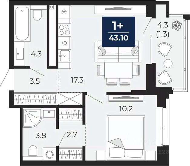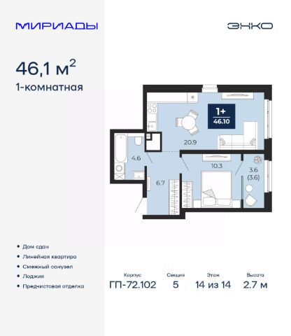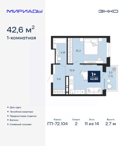 Продается однокомнатная квартира от застройщика с предчистовой отделкой в ЖК "Мириады" на 9 этаже. Общая площадь: 43.1 кв.м., жилая: 10.2 кв.м., площадь просторной кухни-столовой: 17.3 кв.м. Все окна выходят на одну сторону. В квартире один балкон, два совмещенных санузла. Высота потолков 2.7 м. Дом монолитный, двухподъездный, переменной этажности, от 14 до 18 этажей. Квартира находится во 2-й секции высотой 14 этажей в корпусе ГП-72.104. На этаже 8 квартир. В подъезде 1 пассажирский и 1 грузовой лифт. В настоящее время строительство завершено, дом сдан в 4 квартале 2025 года. Оформление сделки по договору купли-продажи. Вселенная бесконечных историй. Ранее невиданный Тюмени масштаб: территория 240 гектаров и 1 650 000 м² застройки. Мириады это город масштабных перемен и больших возможностей. Город зеленых рощ и зеркальных озер. Город для работы, учебы и развлечений. Город для детей и их родителей. Город для всех и каждого. Проект расположен в районе Мыс рядом с ТРЦ "Тюмень Сити Молл" в границах улицы Тимофея Чаркова, Тобольского тракта и объездной дороги. Срок полного освоения территории - до 2034 года. #zMTE0O