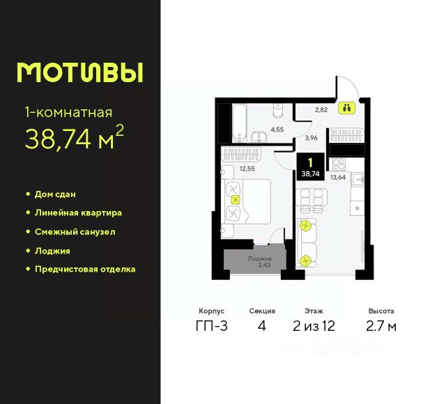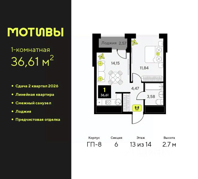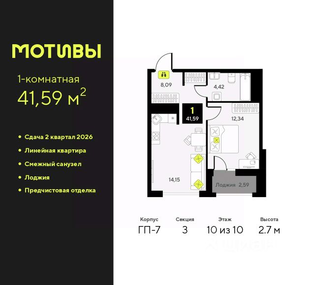 Продается 1-комн. квартира с предчистовой отделкой в ЖК "Мотивы" на 2 этаже. Общая площадь: 41.59 кв.м., жилая: 12.34 кв.м., площадь просторной кухни-столовой: 14.15 кв.м. Все окна выходят на одну сторону. В квартире одна лоджия, один совмещенный санузел. Высота потолков 2.7 м. Квартира будет сдаваться с предчистовой отделкой White Box: выровнены и оштукатурены стены, проведено электричество и отопление, установлены радиаторы. Вы также можете приобрести квартиру с ремонтом от застройщика, представленным в трех цветовых решениях Scandi, Wood и Coffee и включающим ламинат, обои под покраску, двери, натяжной потолок и санузел с сантехникой. При желании вы можете заказать отделку под ключ, варианты возможных решений представлены в альбоме фотографий. Дом монолитный, трехподъездный, высотой 10 этажей. Квартира находится в 1-й секции в корпусе ГП-7. На этаже 5 квартир. В подъезде 1 пассажирский и 1 грузовой лифт. Окончание строительства - 2 квартал 2026 года. Оформление сделки по договору долевого участия. Закрытая от автомобилей территория, безопасный двор и камеры видеонаблюдения - гаранты вашего спокойствия. Квартал будет располагать богатой инфраструктурой: на первых этажах разместятся магазины, пекарни, кофейни, пункты выдачи, аптеки, детские центры, цветочные салоны и многое другое, что сделает жизнь поистине комфортной. Рядом находится парк общей площадью почти 5000 м², в котором располагаются локации для игр и отдыха жителей, здесь можно совершить утреннюю пробежку или прогуляться после рабочего дня. В парке есть зона воркаута с тренажерами для взрослых, игровые комплексы с горками и канатный комплекс для детей разных возрастов, качели и лавочки для отдыха, площадки для командных видов спорта и для панна-футбола. В ЖК "Мотивы" всё продумано до мелочей: светлые холлы входных групп, оформленные в едином стиле, просторные колясочные, лапомойки для питомцев. На территории комплекса находятся 2 8-ми этажных паркинга и более 1000 м/м на открытой парковке. Жилой комплекс находится в одном из экологически благоприятных районов Тюмени, недалеко от Плехановского бора. При этом до центра города можно добраться за 15 минут, а до международного аэропорта Рощино за 13 минут. Окончание строительства: ГП 1, 2, 3, 4 сдача до конца 2024 года, ГП 6, 7, 8 сдача 2 квартал 2026 года. #ZWDD7A