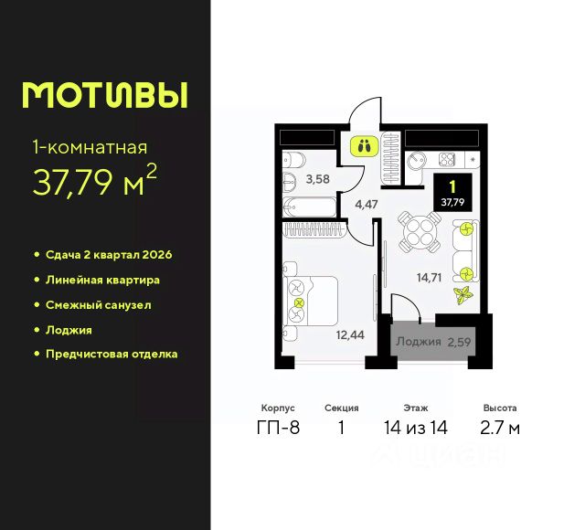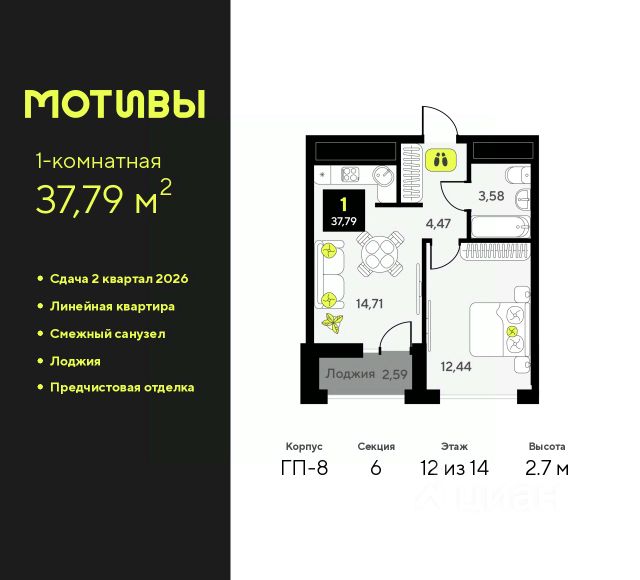 Просторная 1-комн. квартира с первичной отделкой в ЖК "Мотивы" на 8 этаже. Общая площадь: 37.45 кв.м., жилая: 12.01 кв.м., площадь просторной кухни-столовой: 15.83 кв.м. Все окна выходят на одну сторону. В квартире одна лоджия, один совмещенный санузел. Высота потолков 2.7 м. Квартира предоставляется в чистовой отделке: на полу ламинат, на стенах флизелиновые обои под покраску, санузел отделан плиткой, установлена вся сантехника, краны, смесители, душевые лейки и т.д., также в комплектацию входит кондиционер, видеодомофон, вызывная панель домофона уже установлена и подключена к работе. Выбирая место для жизни, вы хотите, чтобы оно было лучше и удобнее. Мы же хотим, чтобы каждый смог получить все, что пожелает при переезде в новый дом. Это наша цель, миссия и главный мотив. Пара шагов от дома и вы оказываетесь в парке, где можно совершить утреннюю пробежку или неспешно прогуляться после рабочего дня. Подъезды в домах сквозные, а входные группы расположены на уровне тротуара - в дом удобно заходить как с улицы, так и со двора. Домофон в тёплом тамбуре не позволит вам замёрзнуть, пока вы открываете двери. А хорошее настроение обеспечат светлые холлы, оформленные в едином стиле. Больше никакой грязи в квартире. Велосипеды и коляски можно оставить в колясочных, которые мы сделали по-настоящему просторными. А обладатели четверногих друзей смогут помыть их лапки после прогулки в специально оборудованных лапомойных комнатах. Квартира с видом на бескрайний природный простор или на урбанистический пейзаж? Легко! Мы создали безопасный двор, где можно без лишних тревог оставить детей играть во дворе. Закрытая от автомобилей территория и камеры видеонаблюдения - гарант вашего спокойствия. #ZwdUTv