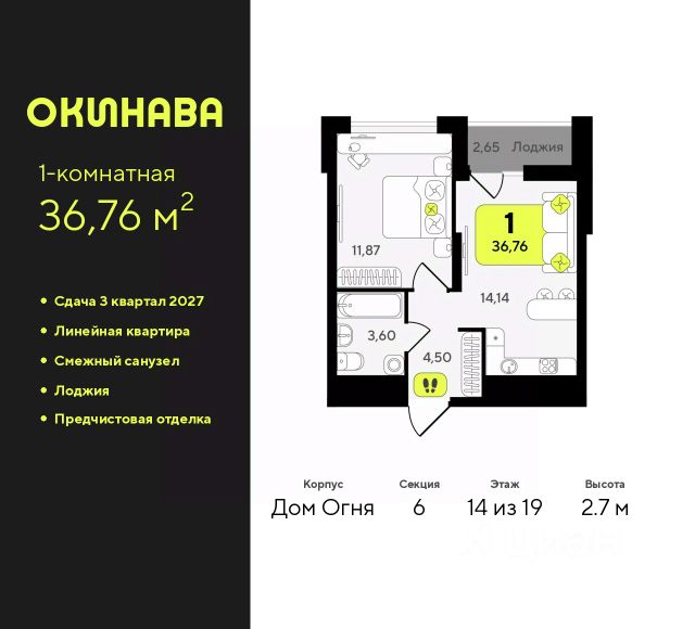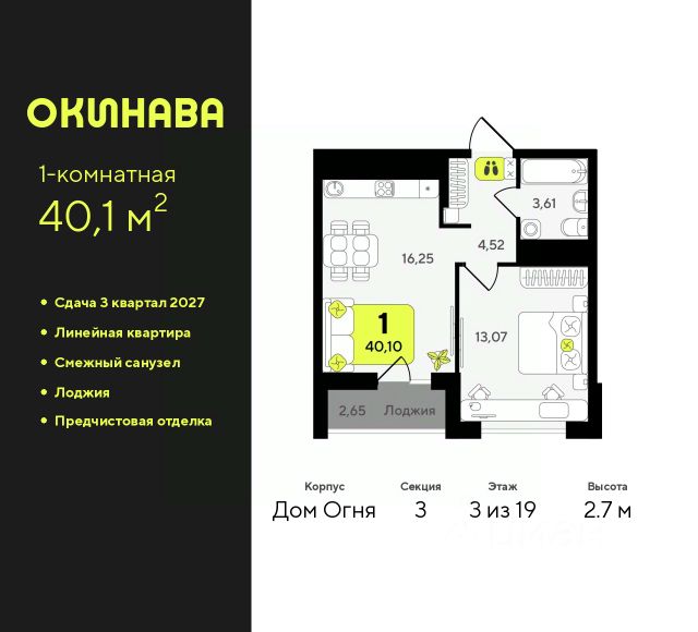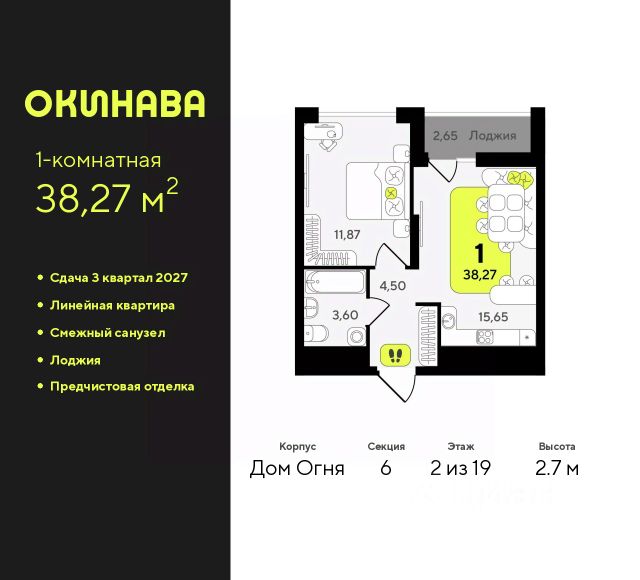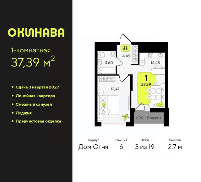 1-комн. квартира с предчистовой отделкой в ЖК "Окинава" на 3 этаже. Общая площадь: 47.32 кв.м., жилая: 14.34 кв.м., площадь просторной кухни-столовой: 16.49 кв.м. Угловая квартира, окна oбecпeчивaют paвнoмepнoe ocвeщeниe в тeчeниe дня. В квартире одна лоджия, один совмещенный санузел. Высота потолков 2.7 м. Квартира будет сдана с предчистовой отделкой: на полах стяжка под финишное покрытие, стены подготовлены под покраску или оклейку обоями, разведена вся электрика с подготовкой для установки выключателей и освещения. При желании вы можете заказать отделку под ключ, варианты возможных решений представлены в альбоме фотографий. Дом монолитный, многоподъездный, переменной этажности, от 13 до 19 этажей. Квартира находится в 7-й секции высотой 17 этажей в корпусе Дом Огня. На этаже 8 квартир. В подъезде 1 пассажирский и 1 грузовой лифт. Окончание строительства - 3 квартал 2027 года. Оформление сделки по договору долевого участия. ЖК "Окинава" это не просто жилой комплекс, это остров 4 стихий. Они отражаются во внешнем виде фасадов домов, обустройстве дворов и внутреннем оформлении холлов. Каждая из стихий это отдельный дом. Между домами раскинется большой двухуровневый пешеходный бульвар. Первый уровень прогулочный с местами для отдыха, амфитеатром и фонтанами. На втором уровне расположатся площадки для детей, спортивных игр и тренировок. Квартал будет располагать богатой инфраструктурой: на первых этажах разместятся магазины, пекарни, кофейни, пункты выдачи, аптеки, детские центры, цветочные салоны и многое другое, что сделает жизнь поистине комфортной. В жилом комплексе есть кладовые, а также несколько видов паркинга: уличный гостевой, закрытый теплый и паркинг в стилобате, попасть в который можно на лифте с любого жилого этажа. Дворы в каждом доме отражают его стихию, отличаясь по наполнению. Они дополняют друг друга, образуя единое дворовое пространство жилого комплекса. Закрытая территория, свободная от автомобилей, обеспечит безопасность и спокойный отдых. Холлы оформлены керамогранитом, зеркалами и разноуровневым освещением. Витражные входные группы, мягкие зоны ожидания, видеонаблюдение 24/7, вместительные колясочные и даже лапомойки для питомцев всё это будет в ЖК "Окинава". Жилой комплекс "Окинава" находится в активно развивающемся V заречном микрорайоне, недалеко от озера Алебашево, где в будущем расположится масштабный ивент-парк с зонами отдыха. Удобная транспортная развязка позволит добраться до центра всего за 15 минут. #zWeUiF