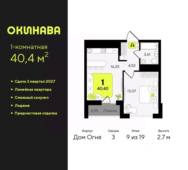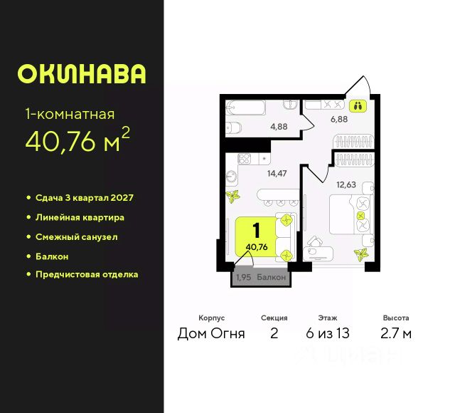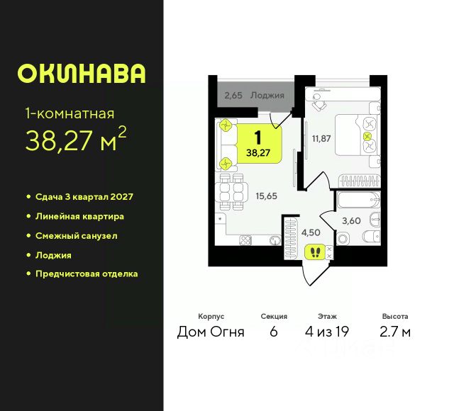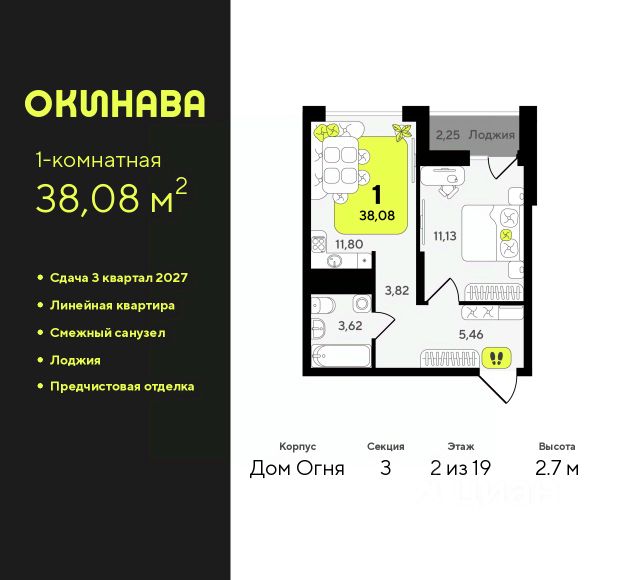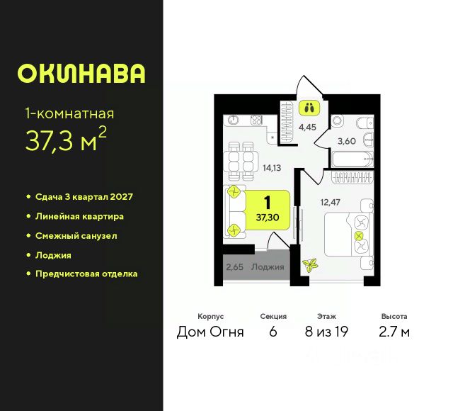 Однокомнатная квартира с предчистовой отделкой в ЖК "Окинава" на 10 этаже. Общая площадь: 42.43 кв.м., жилая: 13.53 кв.м., площадь просторной кухни-столовой: 17.64 кв.м. Все окна выходят на одну сторону. В квартире одна лоджия, один совмещенный санузел. Высота потолков 2.7 м. Квартира будет сдана с предчистовой отделкой: на полах стяжка под финишное покрытие, стены подготовлены под покраску или оклейку обоями, разведена вся электрика с подготовкой для установки выключателей и освещения. При желании вы можете заказать отделку под ключ, варианты возможных решений представлены в альбоме фотографий. Дом монолитный, многоподъездный, переменной этажности, от 13 до 19 этажей. Квартира находится в 3-й секции высотой 19 этажей в корпусе Дом Огня. На этаже 11 квартир. В подъезде 1 пассажирский и 1 грузовой лифт. Окончание строительства - 3 квартал 2027 года. Оформление сделки по договору долевого участия. ЖК "Окинава" это не просто жилой комплекс, это остров 4 стихий. Они отражаются во внешнем виде фасадов домов, обустройстве дворов и внутреннем оформлении холлов. Каждая из стихий это отдельный дом. Между домами раскинется большой двухуровневый пешеходный бульвар. Первый уровень прогулочный с местами для отдыха, амфитеатром и фонтанами. На втором уровне расположатся площадки для детей, спортивных игр и тренировок. Квартал будет располагать богатой инфраструктурой: на первых этажах разместятся магазины, пекарни, кофейни, пункты выдачи, аптеки, детские центры, цветочные салоны и многое другое, что сделает жизнь поистине комфортной. В жилом комплексе есть кладовые, а также несколько видов паркинга: уличный гостевой, закрытый теплый и паркинг в стилобате, попасть в который можно на лифте с любого жилого этажа. Дворы в каждом доме отражают его стихию, отличаясь по наполнению. Они дополняют друг друга, образуя единое дворовое пространство жилого комплекса. Закрытая территория, свободная от автомобилей, обеспечит безопасность и спокойный отдых. Холлы оформлены керамогранитом, зеркалами и разноуровневым освещением. Витражные входные группы, мягкие зоны ожидания, видеонаблюдение 24/7, вместительные колясочные и даже лапомойки для питомцев всё это будет в ЖК "Окинава". Жилой комплекс "Окинава" находится в активно развивающемся V заречном микрорайоне, недалеко от озера Алебашево, где в будущем расположится масштабный ивент-парк с зонами отдыха. Удобная транспортная развязка позволит добраться до центра всего за 15 минут. #ZweiFD