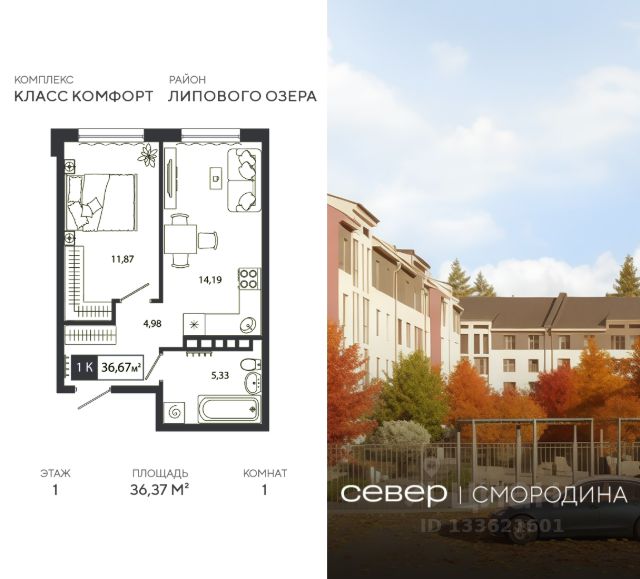 Продаётся квартира площадью 31.66 м2 в жилом комплексе "Смородина". Квартира находится на 1 этаже, жилая площадь квартиры 11.11 м2, площадь просторной кухни — 11.15 м2. Среди особенностей планировки — изолированные комнаты с окнами на одну сторону, 1 совмещённый санузел. Срок сдачи — IV кв. 2026 Жилой комплекс "Смородина" — это: - уютный малоэтажный комплекс в районе ММС - дома высотой 4 этажа - квартиры от студий до семейных вариантов с отапливаемыми лоджиями - экологичные материалы в благоустройстве территории Окружение В 5 минутах ходьбы от проекта — озеро Липовое с песчаным пляжем и лесопарковая зона. Инфраструктура В шаговой доступности есть все для комфортной жизни: школы, детские сады, магазины и аптеки. Рядом с проектом — остановка общественного транспорта. Благоустройство Прямо во дворе — собственные грядки для жителей, где можно выращивать зелень и цветы. Для детей оборудованы детские площадки из натуральных материалов. Лобби Вдохновленные современными тенденциями наши парадные разработаны с акцентом на эстетическую привлекательность и практичность. Использование натуральных материалов и ярких цветовых акцентов создает атмосферу уюта и стиля. Планировки Среди многообразия продуманных планировок есть и уютные студии, и просторные семейные варианты. Во всех квартирах предусмотрены отапливаемые лоджии, где можно устроить зону отдыха или рабочий кабинет.