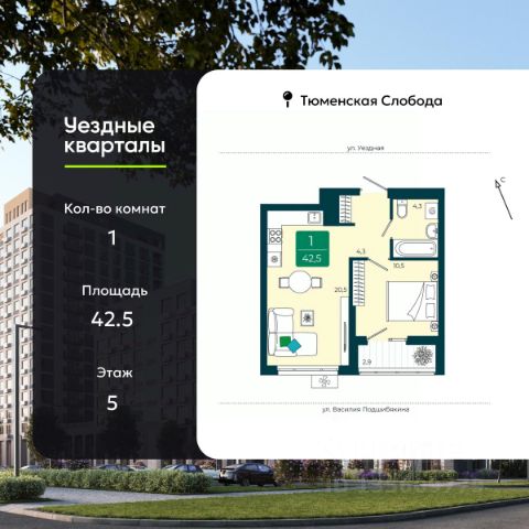 1-комн. квартира от застройщика с предчистовой отделкой в ЖК "Уездные кварталы" на 6 этаже. Общая площадь: 43.9 кв.м., жилая: 10.4 кв.м., площадь просторной кухни-столовой: 21.4 кв.м. Все окна выходят на одну сторону. В квартире одна лоджия, один совмещенный санузел. Высота потолков 2.72 м. Дом монолитный, черырехподъездный, переменной этажности, от 9 до 16 этажей. Квартира находится в 4-й секции высотой 9 этажей в корпусе ГП-5.2. На этаже 6 квартир. В подъезде 1 пассажирский и 1 грузовой лифт. Окончание строительства - 4 квартал 2026 года. Оформление сделки по договору долевого участия. "Уездные кварталы" - семейный жилой комплекс комфорт-класса с авторской архитектурой и трехуровневым ландшафтным озеленением. Рядом расположены крупные транспортные развязки, которые позволяют добраться в любую точку города за 15 минут. Жилой комплекс находится в современном районе с развитой инфраструктурой, на первой линии Тюменской Слободы. Вокруг есть всё необходимое в шаговой доступности: новые детские сады и школы, остановки общественного транспорта, магазины, кафе и рестораны, поликлиника, детская школа искусств, парки и спортивный комплекс. На первых этажах квартала расположена собственная коммерческая сеть, а также свой соседский центр. Проект включает 5 домов переменной этажности с более чем 100 планировками - с террасами, французскими балконами и мастер-спальнями. Закрытые дворы оборудованы интерактивными площадками для игр, спортивными зонами и местами тихого отдыха. Вдоль жилого комплекса расположен пешеходный бульвар с сухим фонтаном, а для автомобилей предусмотрен теплый паркинг. Часть квартир можно приобрести с ремонтом, мебелью и техникой от застройщика, а расходы включить в ипотечный платеж. #2msezD