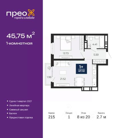 1-комн. квартира с предчистовой отделкой в ЖК "Прео" на 10 этаже. Общая площадь: 41.23 кв.м., жилая: 17.67 кв.м., площадь просторной кухни-столовой: 12.3 кв.м. Все окна выходят на одну сторону. В квартире один балкон, один совмещенный санузел. Высота потолков 2.7 м. Дом монолитный, черырехподъездный, переменной этажности, от 14 до 21 этажей. Квартира находится во 2-й секции высотой 21 этаж в корпусе 211. На этаже 10 квартир. В подъезде 1 пассажирский и 1 грузовой лифт. Окончание строительства - 4 квартал 2026 года. Оформление сделки по договору долевого участия. Преображенский — один из самых привлекательных районов для жизни! Это полностью самостоятельный жилой район с точки зрения инфраструктуры. Преображенский находится между Московским и Червишевским трактами в квартале улиц Закалужская — Вьюжная — Александра Протозанова. Не нужно ждать, когда появится инфраструктура — переезжайте на всё готовое. Вблизи расположены действующие школа и детский сад. В этом году откроется еще один сад, а в следующем году — школа. По соседству с Преображенским запланировано строительство городского парка "Комарово" площадью 38 гектар. За 10 минут можно доехать на автомобиле до крупных ТРЦ: "Лента", "Кристалл", "Леруа Мерлен", "Метро" и "Ашан". С 2018 года в районе открыт Соседский центр — пространство, созданное для формирования добрососедской среды, совместного досуга, общения и реализации соседских инициатив. Здесь проходят встречи соседей, а также сами жители района организовывают мероприятия. Организатором такого события может стать любой желающий. В квартирах выполнена качественная предчистовая отделка. Гладкие стены с финишным выравниванием по маякам. Ровный потолок для установки натяжного потолка. Установлены пятикамерные окна с двойным стеклопакетом (3 стекла). Дизайнерские холлы с видеонаблюдением, безбарьерным и прозрачным входом всегда светло и спокойно. На первом этаже есть просторные колясочные, где все жители могут оставлять свои коляски и велосипеды. В Преображенском есть всё, что нужно для активного отдыха и занятий спортом. Мы сделали большое футбольное поле с безопасным покрытием. Также установили хоккейный корт, который оборудован по всем необходимым стандартам. Во дворах можно делать упражнения на специальных площадках с турниками. Весь район мы обустроили велодорожками, которые связаны в единый маршрут. У нас есть сухие фонтаны, бьющие из земли, деревья, веревки, сетки, скалодром, газон, песок и резинка — осталось просто дать своему ребенку право на свободную игру. По-настоящему хорошие дворы — это те, которые дети предпочитают соцсетям и телевизору. Аккредитация в банках: ОАО "Альфа-Банк", "Сбербанк России", ПАО "Газпромбанк", ПАО Банк "ВТБ", ПАО "Банк Уралсиб" и других. #ZsOaMD