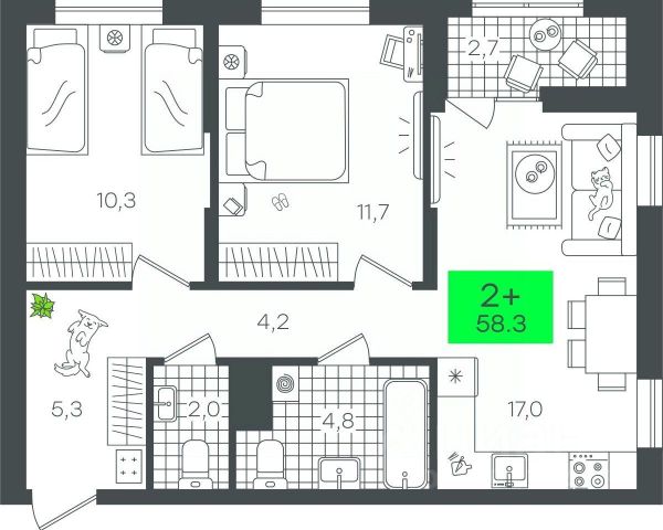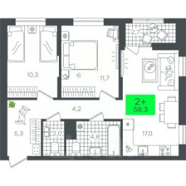 2-комн. квартира с предчистовой отделкой в ЖК "Прео" на 10 этаже. Общая площадь: 58.54 кв.м., жилая: 24.73 кв.м., площадь просторной кухни-столовой: 17.76 кв.м. Квартира угловая, идеально подойдет любителям тишины и панорамных видов. В квартире одна лоджия, один совмещенный санузел. Высота потолков 2.7 м.