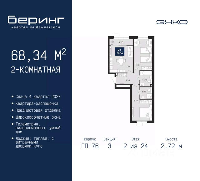 2-комн. квартира в ЖК "Беринг" на 21 этаже. Квартира без отделки, новый собственник может сделать ремонт по своему проекту. Общая площадь: 71.15 кв.м., жилая: 31.03 кв.м., площадь просторной кухни-столовой: 20.6 кв.м. Квартира - распашонка, без проходных комнат, окна выходят на paзные стороны дома. В квартире один балкон, один раздельный санузел. Высота потолков 2.75 м. Дом монолитный, многоподъездный, переменной этажности, от 9 до 21 этажей. Квартира находится в 74.5-й секции высотой 21 этаж в корпусе ГП-74. На этаже 7 квартир. В подъезде 1 пассажирский и 1 грузовой лифт. Окончание строительства - 4 квартал 2025 года. Оформление сделки по договору долевого участия. Подобно знаменитому исследователю, мы чувствуем себя первооткрывателями этой локации. Хотим показать новую суть места, сформировать для вас жизненный опыт, которого ещё не было. Беринг — район зелёного цвета. Беринг — район, который откроется вам с другой стороны. Впечатлит новым уровнем комфорта и качеством жизни. Беринг — открытие на карте города. Первый квартал расположен в районе Тура, в границах улиц: Камчатская Западносибирская Энтузиастов. Вокруг уже есть всё для того, чтобы ежедневная рутина была лишь частью жизни и не доставляла дискомфорта. Школы и детские сады, магазины и аптеки, поликлиника, места для семейного отдыха, пеших и велопрогулок, и даже рыбалки. Масштабное озеленение дворов — визитная карточка ЭНКО и ваш оазис спокойствия, чтобы отвлечься от повседневности. Раскидистые деревья, кустарники, травы и цветы — осталось остановиться, вдохнуть и расслабиться, глядя на эту природную красоту. Стилистика подъездов продолжает концепцию Беринга, вдохновлённого Камчаткой: сдержанный, но при этом впечатляющий дизайн соседствует с удобством и функциональностью. #zU5TEV 2-комнатная квартира, примерная площадь 70 м2 в Тюмени.