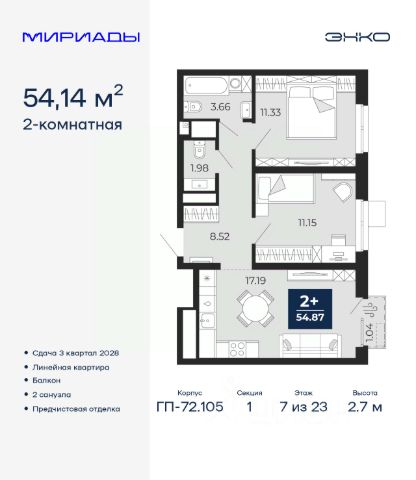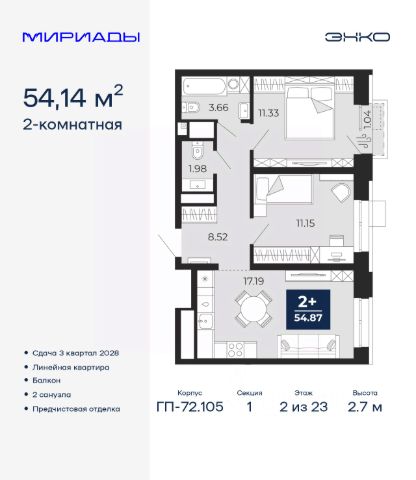 Успейте забронировать по этой цене! Предложение ограничено! Стоимость квартиры указана со скидкой, ваша экономия составит 318,888 RUB. Звоните, наши менеджеры вам все расскажут! Продается двухкомнатная квартира с европланировкой и предчистовой отделкой в ЖК "Мириады" на 1 этаже. Общая площадь: 40.7 кв.м., жилая: 20.7 кв.м., суммарная площадь гостиной-столовой с кухонной зоной: 15.4 кв.м. Европейская планировка, кухня-гостиная - идеальный вариант для тех, кто любит часто принимать гостей. Комнаты изолированные, все окна выходят на одну сторону. В квартире одна лоджия, один совмещенный санузел. Высота потолков 2.7 м. Дом монолитный, двухподъездный, переменной этажности, от 14 до 18 этажей. Квартира находится во 2-й секции высотой 14 этажей в корпусе ГП-72.104. На этаже 8 квартир. В подъезде 1 пассажирский и 1 грузовой лифт. На сегодняшний день строительство окончено, дом сдан в 4 квартале 2025 года. Оформление сделки по договору купли-продажи. Вселенная бесконечных историй. Ранее невиданный Тюмени масштаб: территория 240 гектаров и 1 650 000 м² застройки. Мириады это город масштабных перемен и больших возможностей. Город зеленых рощ и зеркальных озер. Город для работы, учебы и развлечений. Город для детей и их родителей. Город для всех и каждого. Проект расположен в районе Мыс рядом с ТРЦ "Тюмень Сити Молл" в границах улицы Тимофея Чаркова, Тобольского тракта и объездной дороги. Срок полного освоения территории - до 2034 года. #Z6TdcV