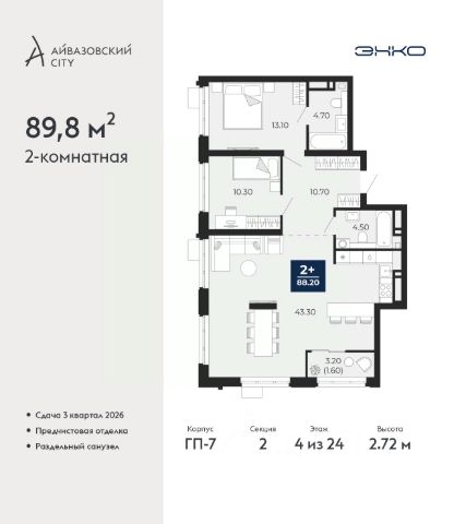 Двухкомнатная квартира от застройщика в ЖК "Айвазовский City" на 2 этаже. Квартира без отделки, полностью готова к ремонту. Общая площадь: 90.06 кв.м., жилая: 42.88 кв.м., площадь просторной кухни-столовой: 23.18 кв.м. Угловая квартира, очень светлая, естественная вентиляция при открытии окон. В квартире одна лоджия, два совмещенных санузла. Высота потолков 2.72 м. Дом монолитный, многоподъездный, переменной этажности, от 5 до 21 этажей. Квартира находится в 5-й секции высотой 9 этажей в корпусе ГП-5. На этаже 5 квартир. В подъезде 1 пассажирский и 1 грузовой лифт. На сегодняшний день строительство завершено, дом сдан в 4 квартале 2023 года. Оформление сделки по договору купли-продажи. Новый жилой район располагается в живописном месте на берегу Туры в центральной части города. Принципиально новое пространство для жизни в центре современного города для тех, чьи мечты сбываются, кто нацелен на постоянный рост, перемены к лучшему для себя и своих близких. Каждая деталь Айвазовский City вдохновляет и заряжает на новые свершения: авторская архитектура, сбалансированная продуманная инфраструктура, дизайнерские дворы со спортивными и детскими площадками, парковые зоны с фонтанами, водный канал, украшающий центральный прогулочный маршрут района и многое другое. В 2019 года проект стал лауреатом престижной премии Urban Awards 2019 в номинации "Лучший строящийся региональный жилой комплекс бизнес-класса". Главная особенность Айвазовский City - соседство разных архитектурных школ в рамках одного дома. Изысканная классика, выразительная эклектика и оригинальный модерн - жить в одном из таких домов настоящий повод для гордости. Айвазовский City это идеальное сочетание комфорта, технологий и развитой инфраструктуры. Вход в подъезд возможен с улицы и со двора. Отправляясь на работу или за покупками, жители могут выйти с внешней стороны дома, а для прогулки с ребенком со стороны двора. Экологически чистые материалы и энергосберегающие технологии, качественное освещение общественных зон, видеонаблюдение по всей территории жилого района (в том числе в подъездах, лифтах и в подземном паркинге), закрытые дворы с доступом только для жителей Айвазовский City. Часть домов в Айвазовский City будут оснащены подземным паркингом. Востребованный в нашем климатическом поясе формат хранения автомобилей защитит собственность владельца в любое время года. Аккредитация в банках: ПАО Банк "ВТБ", ПАО "Газпромбанк", "Сбербанк России", ОАО "Альфа-Банк", АО "ДОМ.РФ" и других. #1C4AaZ Купить 2-комнатную квартиру площадью примерно 90 м2 (кв.м.) в Тюмени.