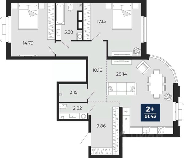 Квартира с кухней-гостиной и двумя спальнями в Октябрьском на Туре. Особенности планировки: вид во двор, гардеробная, мастер-спальня, разнесённые спальни, свободная планировка, терраса на крыше. квартиры в нашей базе: ОКТ-10-1-1.7.1. Район Проект расположен на берегу реки, в одном из самых живописных и экологичных районов Тюмени. За последние годы облик района изменился. По соседству с индивидуальной застройкой выросли многоквартирные дома. При проектировании "Октябрьского на Туре" нашей приоритетной задачей стало сохранение природного ландшафта: мы постарались деликатно вписать в него современную архитектуру. Квартал удачно расположен с точки зрения дорожной инфраструктуры. На автомобиле путь до центра города составит 15 минут. Добраться до набережной и главных тюменских достопримечательностей можно и на общественном транспорте. В пешей доступности находится автобусная остановка. Проект По мастер-плану здесь будет восемь домов. Ядро застройки составляют замкнутые кварталы переменной этажности. Их высотность понижается по мере приближения к реке. На углах участка мы разместили башни-доминанты. Одной из достопримечательностей квартала станет парк на Туре — здесь появится зеленая зона протяженностью около 6 километров для пеших и велопрогулок. Смысловая ось квартала — широкая главная улица с высаженными вдоль неё высокими деревьями. Они создают тень и работают как шумо- и пылезащитные экраны. Это место сосредоточения основных пешеходных и транспортных потоков, на сторону которых мы ориентировали большинство коммерческих помещений. Отсюда жители могут свернуть на тихие соседские улицы и попасть на внутриквартальную площадь — ещё одну точку притяжения. #ZwIbwm Купить 2-комнатную квартиру площадью примерно 90 м2 (кв.м.) в Тюмени.