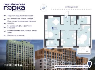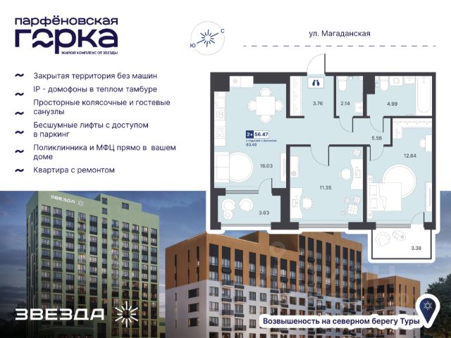 Продается 2-комн. квартира от застройщика в ЖК "Айвазовский City" на 5 этаже. Квартира без отделки, после оформления собственности можно делать ремонт. Общая площадь: 63.58 кв.м., жилая: 26.79 кв.м., площадь просторной кухни-столовой: 16.67 кв.м. Квартира угловая, очень светлая, естественная вентиляция при открытии окон. В квартире одна лоджия, два совмещенных санузла. Высота потолков 2.72 м. Дом монолитный, многоподъездный, переменной этажности, от 9 до 24 этажей. Квартира находится в 3-й секции высотой 24 этажа в корпусе ГП-4. На этаже 6 квартир. В подъезде 2 пассажирских и 2 грузовых лифта. В настоящее время строительство окончено, дом сдан в 4 квартале 2023 года. Оформление сделки по договору купли-продажи. Новый жилой район располагается в живописном месте на берегу Туры в центральной части города. Принципиально новое пространство для жизни в центре современного города для тех, чьи мечты сбываются, кто нацелен на постоянный рост, перемены к лучшему для себя и своих близких. Каждая деталь Айвазовский City вдохновляет и заряжает на новые свершения: авторская архитектура, сбалансированная продуманная инфраструктура, дизайнерские дворы со спортивными и детскими площадками, парковые зоны с фонтанами, водный канал, украшающий центральный прогулочный маршрут района и многое другое. В 2019 года проект стал лауреатом престижной премии Urban Awards 2019 в номинации "Лучший строящийся региональный жилой комплекс бизнес-класса". Главная особенность Айвазовский City - соседство разных архитектурных школ в рамках одного дома. Изысканная классика, выразительная эклектика и оригинальный модерн - жить в одном из таких домов настоящий повод для гордости. Айвазовский City это идеальное сочетание комфорта, технологий и развитой инфраструктуры. Вход в подъезд возможен с улицы и со двора. Отправляясь на работу или за покупками, жители могут выйти с внешней стороны дома, а для прогулки с ребенком со стороны двора. Экологически чистые материалы и энергосберегающие технологии, качественное освещение общественных зон, видеонаблюдение по всей территории жилого района (в том числе в подъездах, лифтах и в подземном паркинге), закрытые дворы с доступом только для жителей Айвазовский City. Часть домов в Айвазовский City будут оснащены подземным паркингом. Востребованный в нашем климатическом поясе формат хранения автомобилей защитит собственность владельца в любое время года. Аккредитация в банках: ОАО "Альфа-Банк", ПАО Банк "ВТБ", ПАО "Газпромбанк", "Сбербанк России", ПАО Банк "ФК Открытие" и других. #Z67fdE