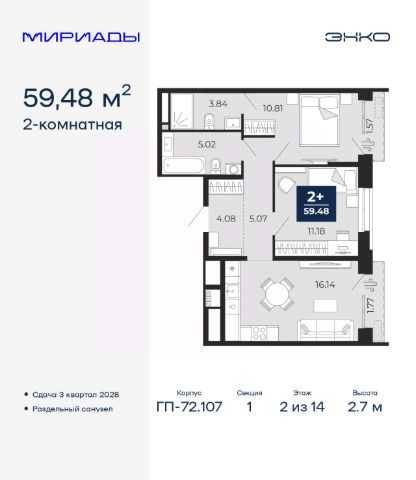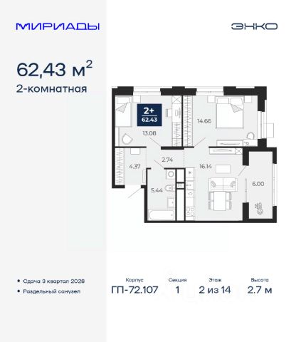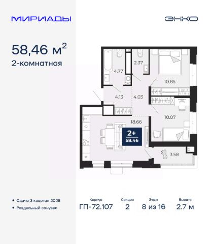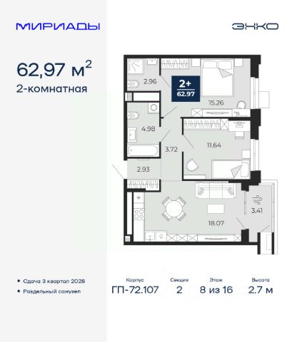 Спешите оформить бронирование на этих условиях, период предложения ограничен! Стоимость квартиры указана со скидкой, ваша экономия составит 387,500 руб. Звоните, наши менеджеры вам все расскажут. Просторная 2-комн. квартира в ЖК "Мириады" на 13 этаже. Общая площадь: 56.47 кв.м. Высота потолков 2.7 м. Квартира находится в корпусе ГП-72.105. Дом монолитный, одноподъездный, высотой 23 этажа. На этаже 8 квартир. В подъезде 2 пассажирских и 1 грузовой лифт. Начало строительства - 1 квартал 2026 года. Окончание строительства - 3 квартал 2028 года. Оформление сделки по договору долевого участия. Вселенная бесконечных историй. Ранее невиданный Тюмени масштаб: территория 240 гектаров и 1 650 000 м² застройки. Мириады это город масштабных перемен и больших возможностей. Город зеленых рощ и зеркальных озер. Город для работы, учебы и развлечений. Город для детей и их родителей. Город для всех и каждого. Проект расположен в районе Мыс рядом с ТРЦ "Тюмень Сити Молл" в границах улицы Тимофея Чаркова, Тобольского тракта и объездной дороги. Срок полного освоения территории - до 2034 года. #ZmDfgd