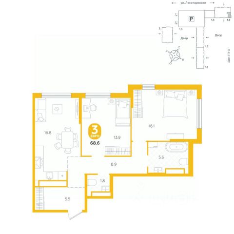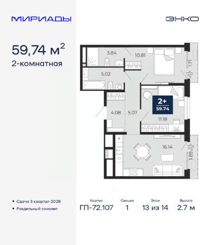 Спешите оформить бронирование на этих условиях, период предложения ограничен! Стоимость квартиры указана со скидкой, ваша экономия составит 387,500 руб. Звоните, наши менеджеры вам все расскажут. Просторная 2-комн. квартира в ЖК "Мириады" на 13 этаже. Общая площадь: 56.47 кв.м. Высота потолков 2.7 м. Квартира находится в корпусе ГП-72.105. Дом монолитный, одноподъездный, высотой 23 этажа. На этаже 8 квартир. В подъезде 2 пассажирских и 1 грузовой лифт. Начало строительства - 1 квартал 2026 года. Окончание строительства - 3 квартал 2028 года. Оформление сделки по договору долевого участия. Вселенная бесконечных историй. Ранее невиданный Тюмени масштаб: территория 240 гектаров и 1 650 000 м² застройки. Мириады это город масштабных перемен и больших возможностей. Город зеленых рощ и зеркальных озер. Город для работы, учебы и развлечений. Город для детей и их родителей. Город для всех и каждого. Проект расположен в районе Мыс рядом с ТРЦ "Тюмень Сити Молл" в границах улицы Тимофея Чаркова, Тобольского тракта и объездной дороги. Срок полного освоения территории - до 2034 года. #ZmDfgd