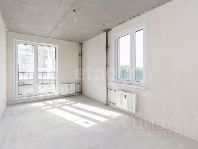 Просторная кухня правильной формы, гостиная 17, м² с окнами на две стороны и выходом на лоджию.